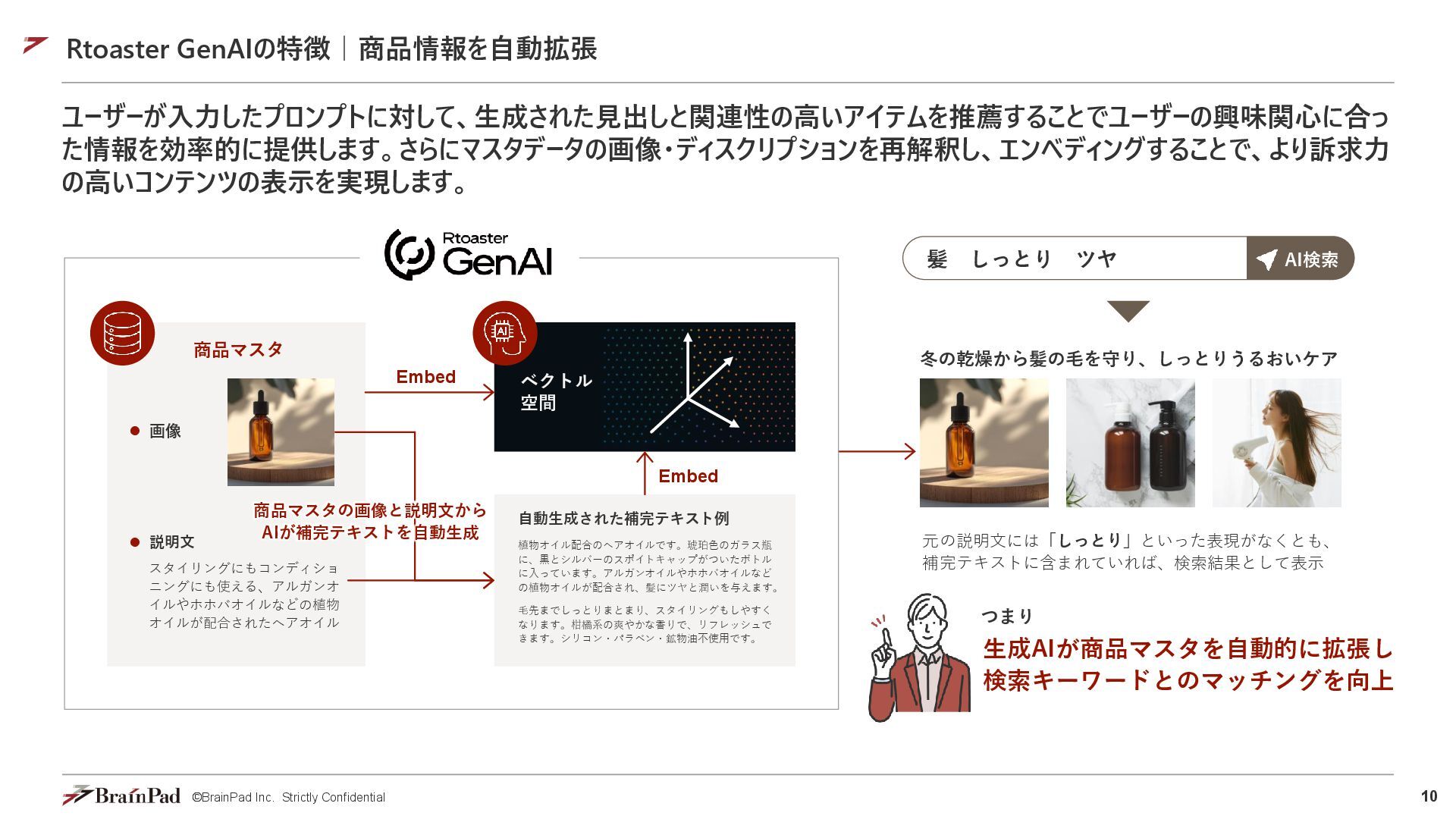 7. 10 ©BrainPad Inc. Strictly Confidential Rtoaster GenAIの特徴|商品情報を自動拡張 ユーザーが入力したプロンプトに対して、生成された見出しと関連性の高いアイテムを推薦することでユーザーの興味関心に合っ た情報を効率的に提供します。さらにマスタデータの画像・ディスクリプションを再解釈し、エンベディングすることで、より訴求力 の高いコンテンツの表示を実現します。