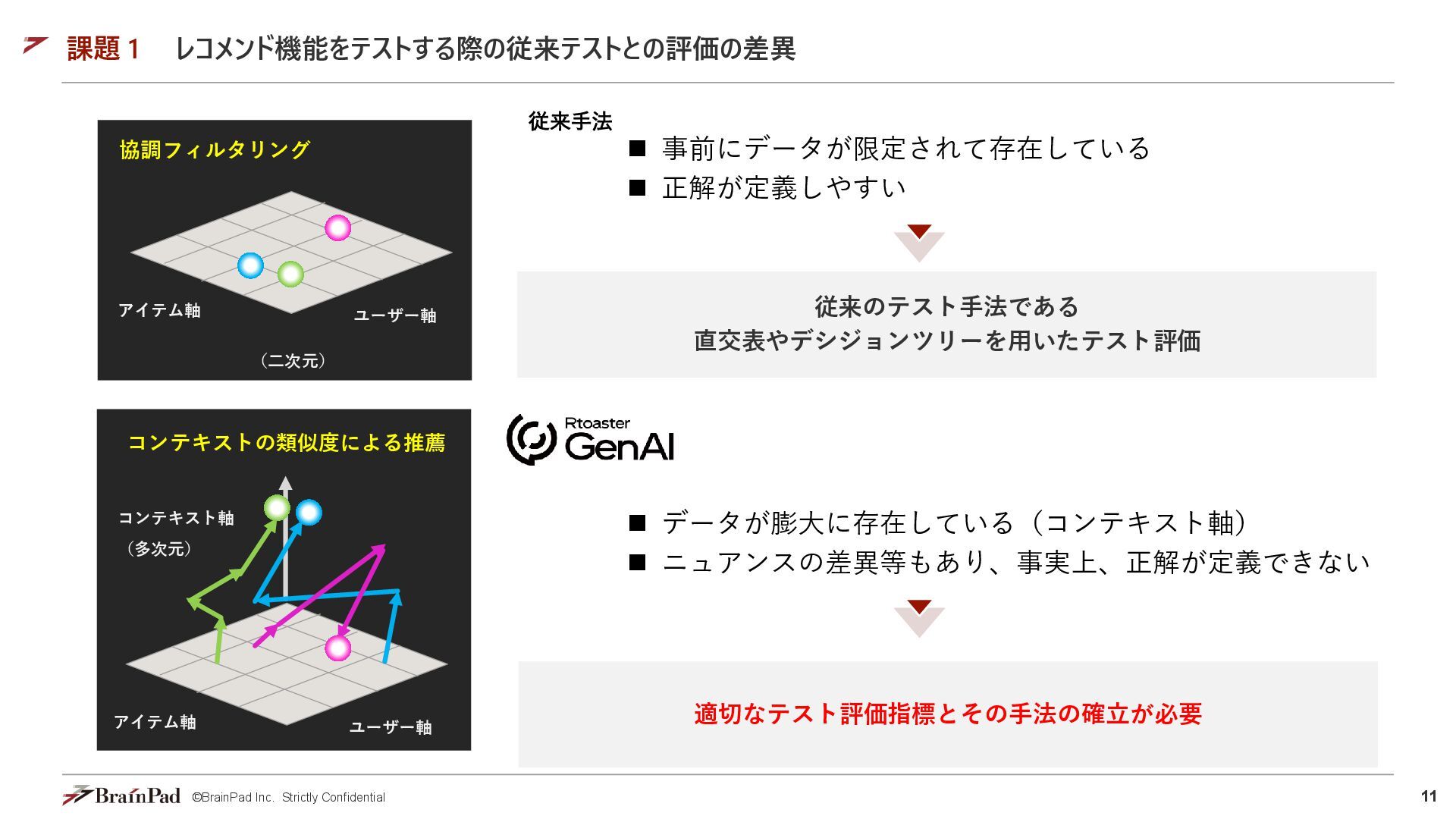 8. 11 ©BrainPad Inc. Strictly Confidential 課題 1 レコメンド機能をテストする際の従来テストとの評価の差異 ユーザー軸 アイテム軸