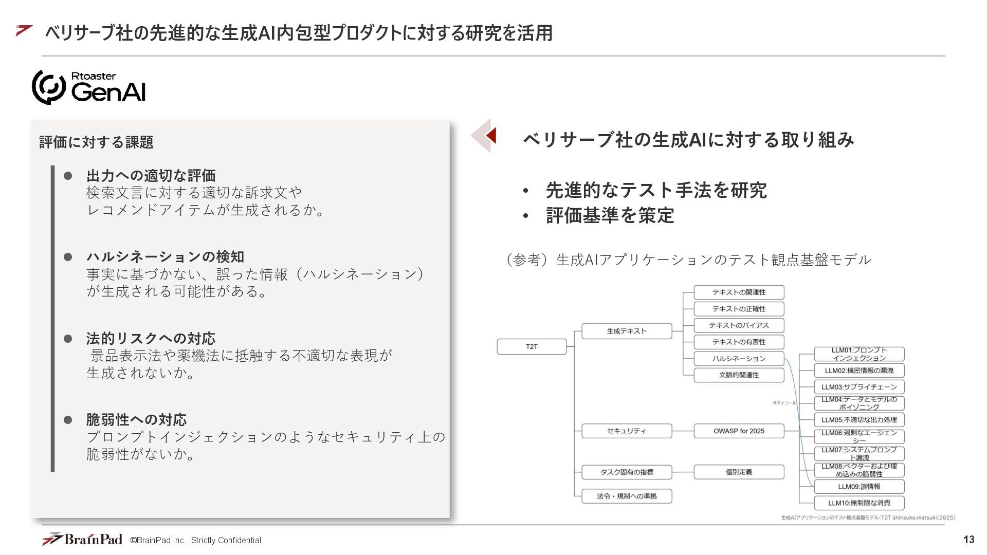 10. 13 ©BrainPad Inc. Strictly Confidential ベリサーブ社の先進的な生成AI内包型プロダクトに対する研究を活用 ベリサーブ社の生成AIに対する取り組み • 先進的なテスト手法を研究 •