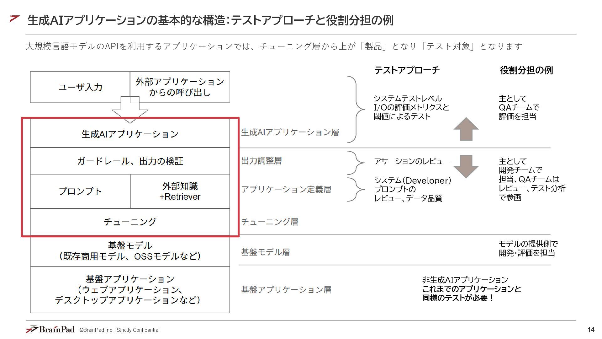 11. 14 ©BrainPad Inc. Strictly Confidential 生成AIアプリケーションの基本的な構造:テストアプローチと役割分担の例 大規模言語モデルのAPIを利用するアプリケーションでは、チューニング層から上が「製品」となり「テスト対象」となります システムテストレベル I/Oの評価メトリクスと 閾値によるテスト
