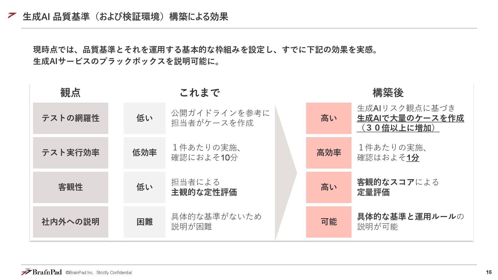 13. 16 ©BrainPad Inc. Strictly Confidential 生成AI 品質基準(および検証環境)構築による効果 観点 これまで 構築後