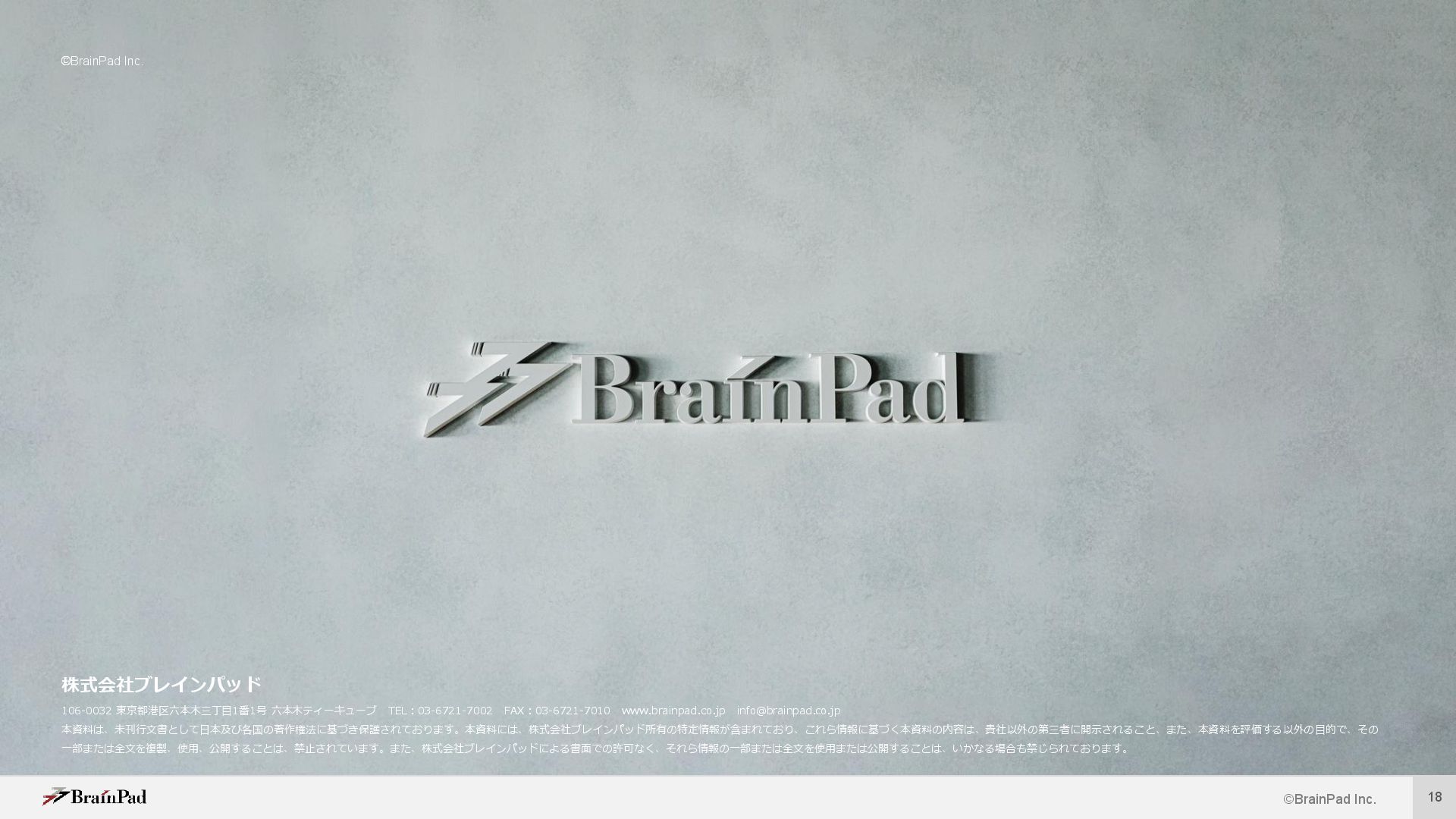 14. ©BrainPad Inc. 18 株式会社ブレインパッド 106-0032 東京都港区六本木三丁目1番1号 六本木ティーキューブ TEL:03-6721-7002 FAX:03-6721-7010 www.brainpad.co.jp