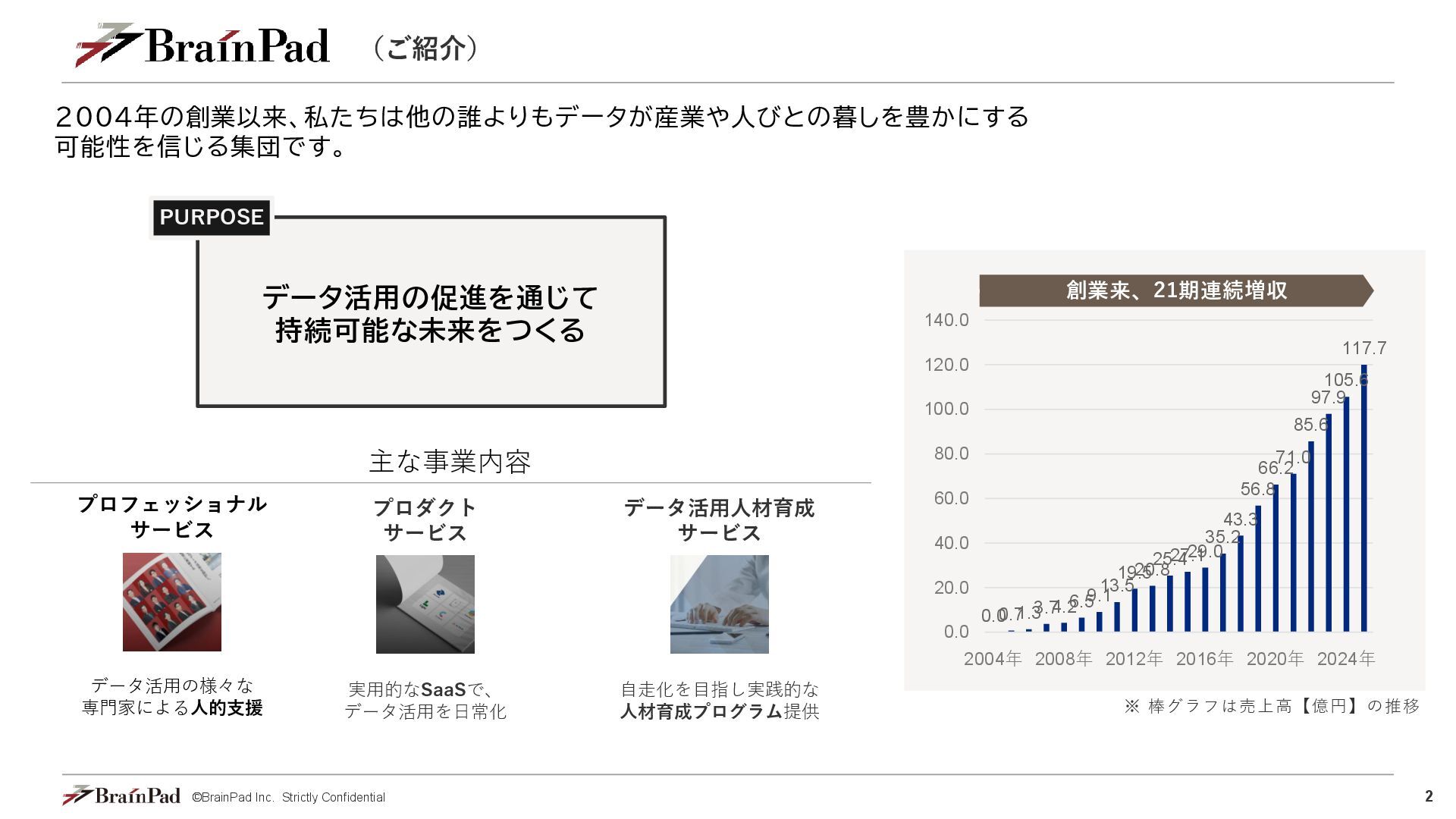 専門家による人的支援 プロダクト サービス 実用的なSaaSで、 データ活用を日常化 データ活用人材育成 サービス 自走化を目指し実践的な 人材育成プログラム提供 0.0 0.7 1.3 3.7 4.2 6.5 9.1 13.5 19.5 20.8 25.4 27.1 29.0 35.2 43.3 56.8 66.2 71.0 85.6 97.9 105.6 117.7 0.0 20.0 40.0 60.0 80.0 100.0 120.0 140.0 2004年 2008年 2012年 2016年 2020年 2024年 創業来、21期連続増収 ※ 棒グラフは売上高【億円】の推移 データ活用の促進を通じて 持続可能な未来をつくる PURPOSE 2004年の創業以来、私たちは他の誰よりもデータが産業や人びとの暮しを豊かにする 可能性を信じる集団です。