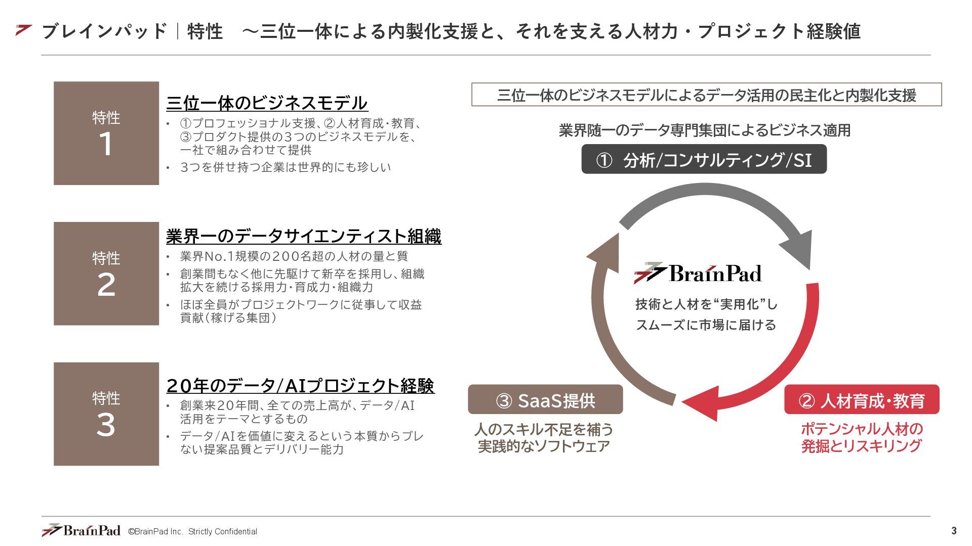 3. 3 ©BrainPad Inc. Strictly Confidential ブレインパッド|特性 ~三位一体による内製化支援と、それを支える人材力・プロジェクト経験値 技術と人材を“実用化”し スムーズに市場に届ける 人のスキル不足を補う