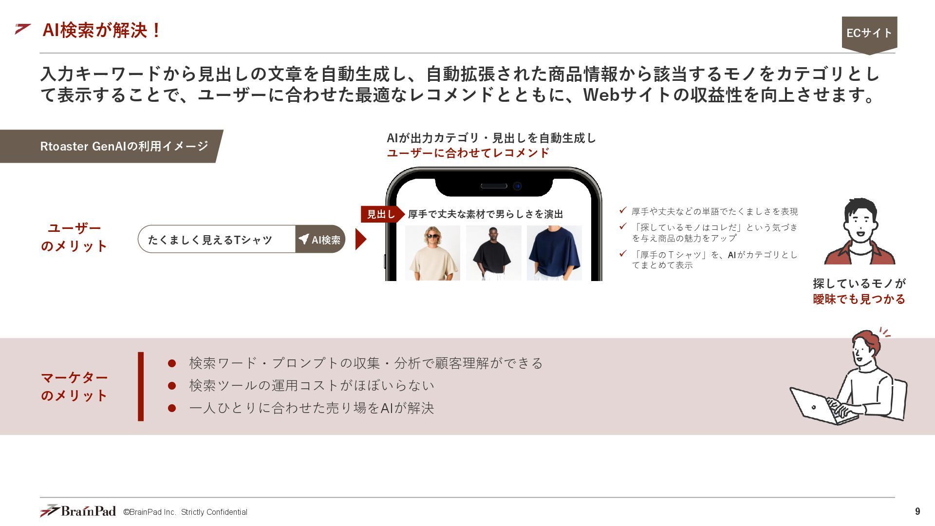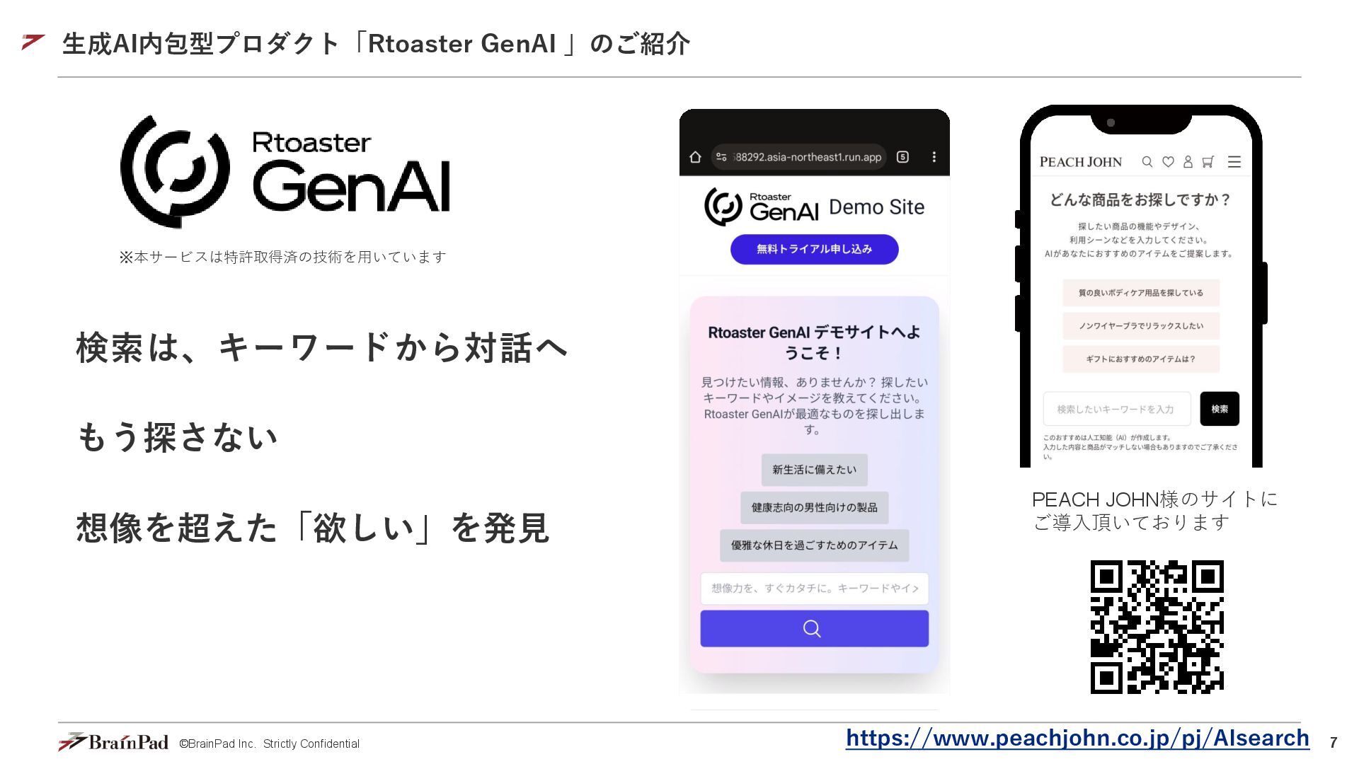 6. 9 ©BrainPad Inc. Strictly Confidential 入力キーワードから見出しの文章を自動生成し、自動拡張された商品情報から該当するモノをカテゴリとし て表示することで、ユーザーに合わせた最適なレコメンドとともに、Webサイトの収益性を向上させます。 AI検索が解決! ⚫ 検索ワード・プロンプトの収集・分析で顧客理解ができる