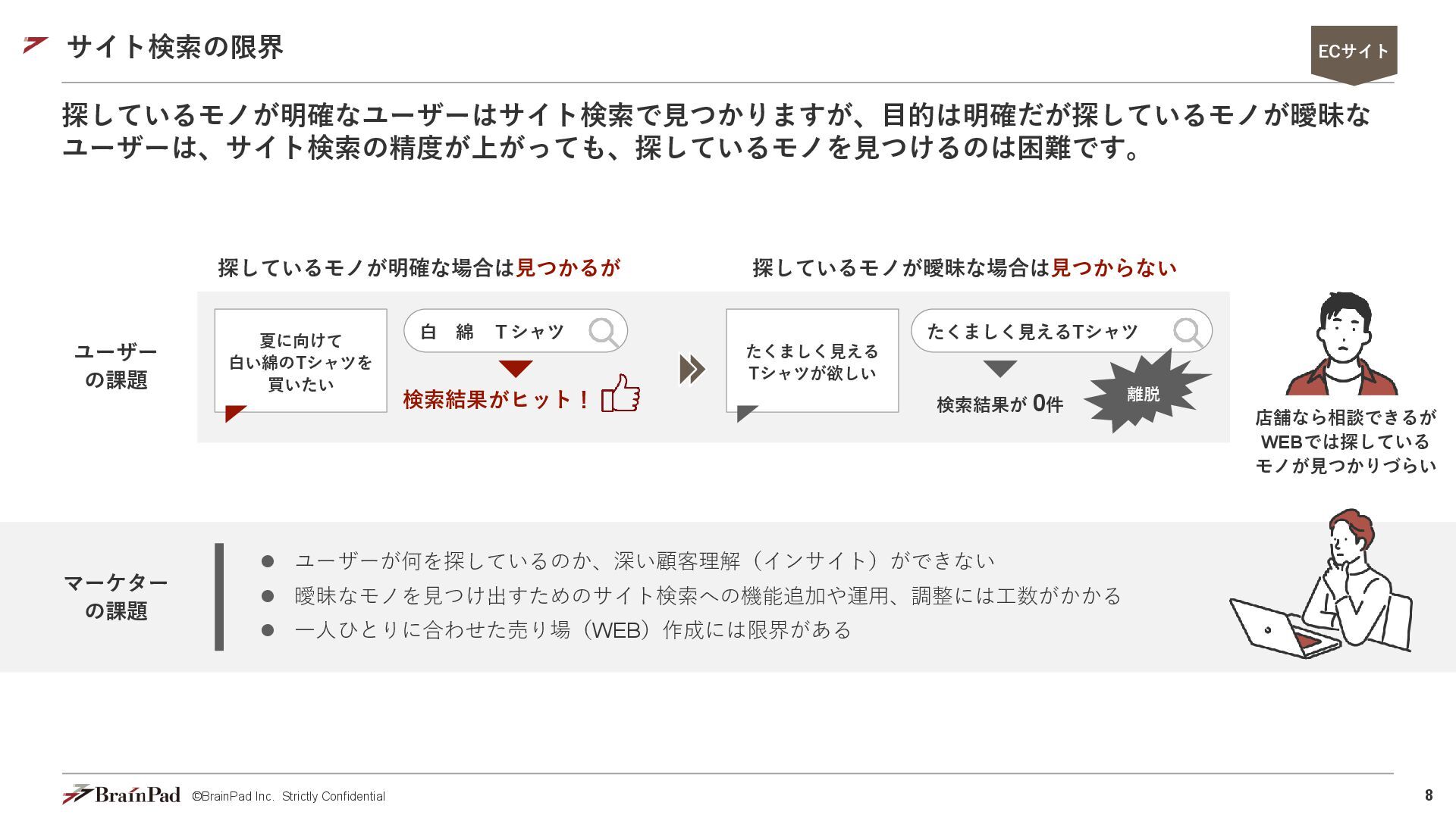 5. 8 ©BrainPad Inc. Strictly Confidential サイト検索の限界 ⚫ ユーザーが何を探しているのか、深い顧客理解(インサイト)ができない ⚫ 曖昧なモノを見つけ出すためのサイト検索への機能追加や運用、調整には工数がかかる