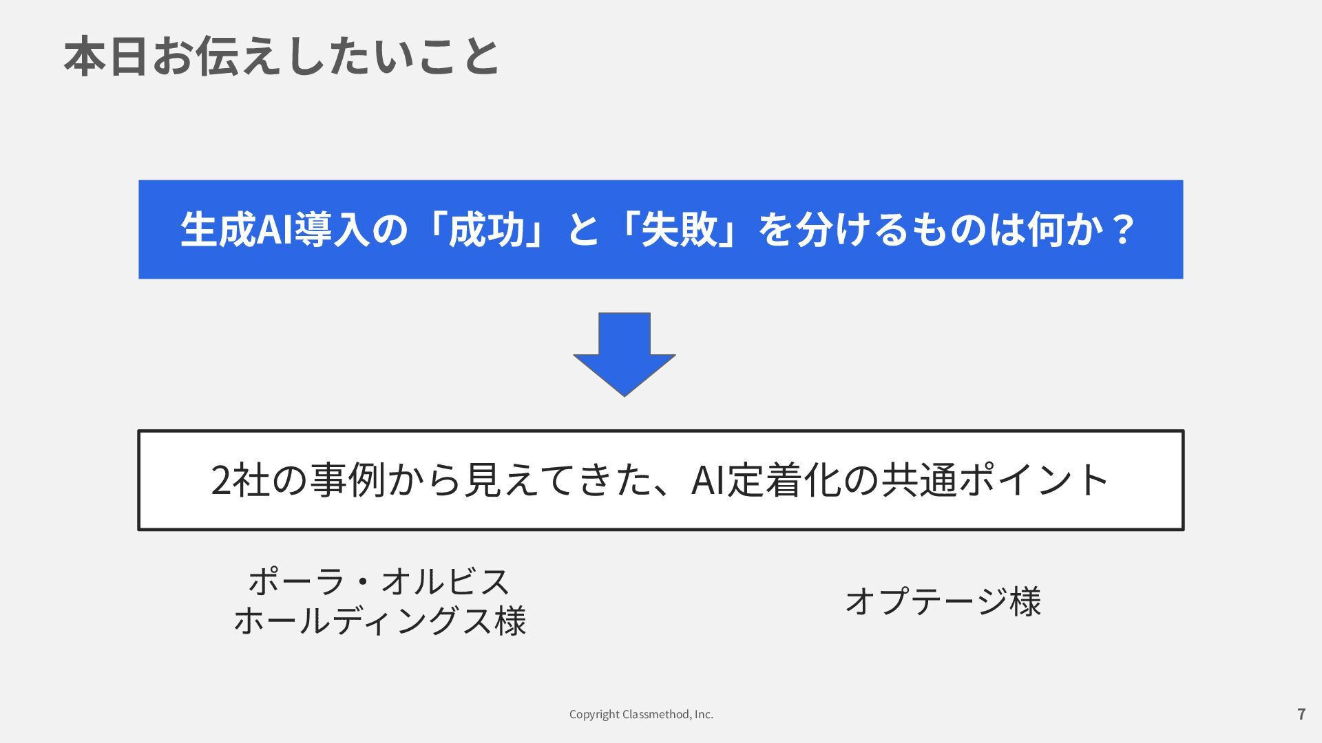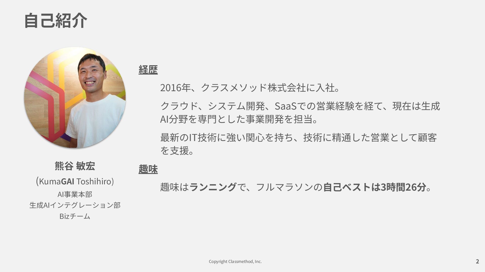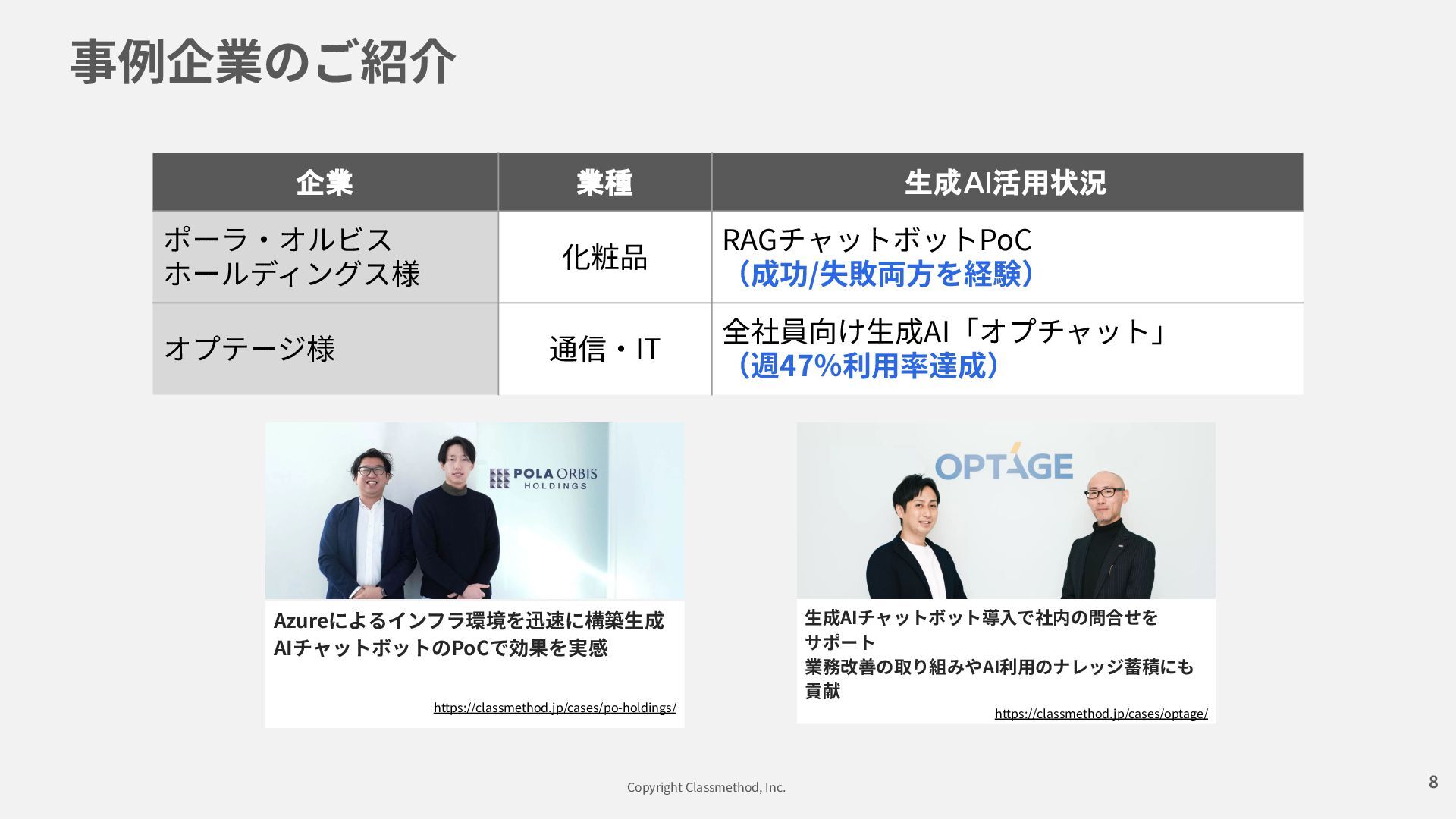 2. Copyright Classmethod, Inc. 8 事例企業のご紹介 ⽣成AIチャットボット導⼊で社内の問合せを サポート 業務改善の取り組みやAI利⽤のナレッジ蓄積にも 貢献 https://classmethod.jp/cases/optage/