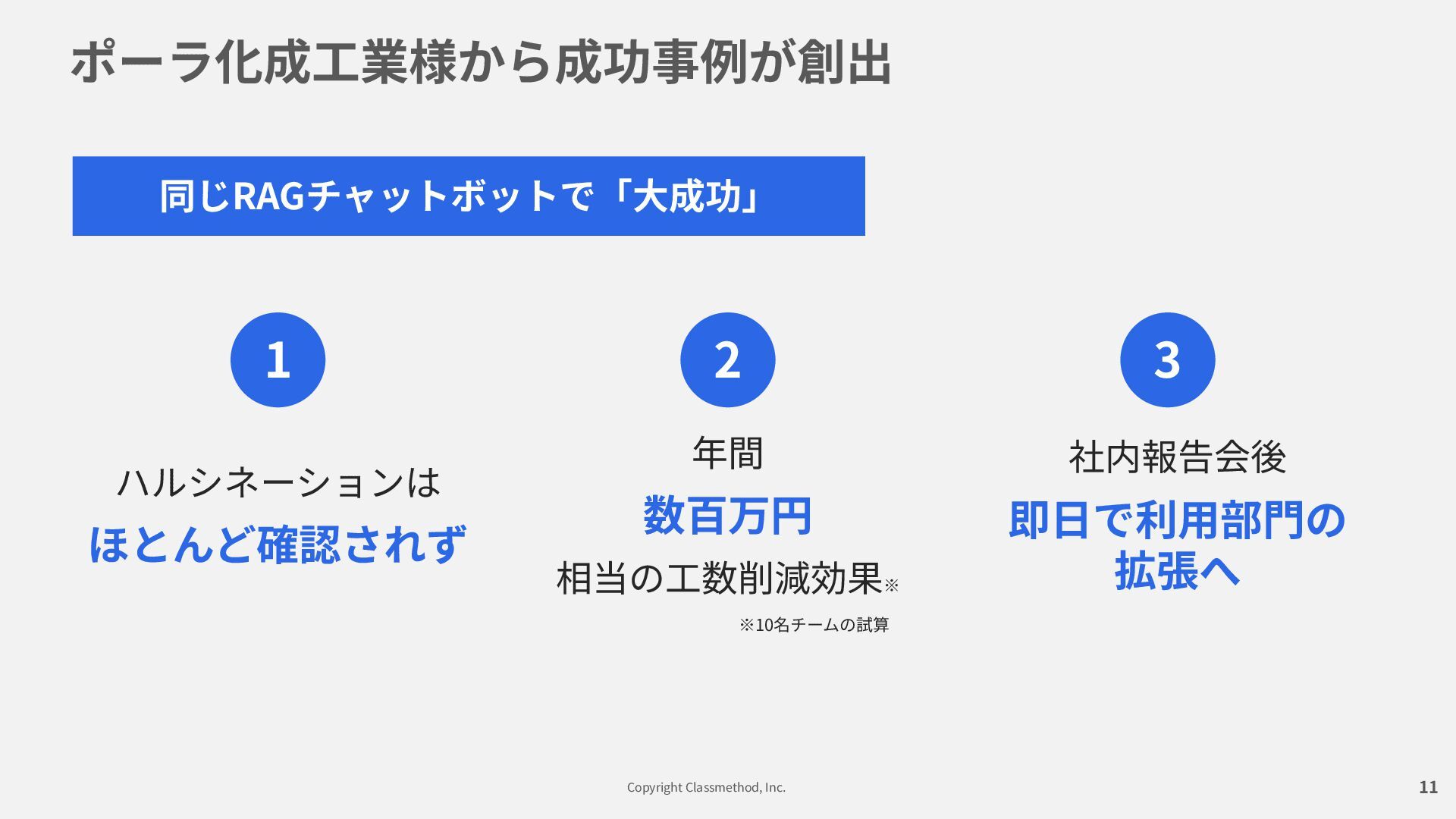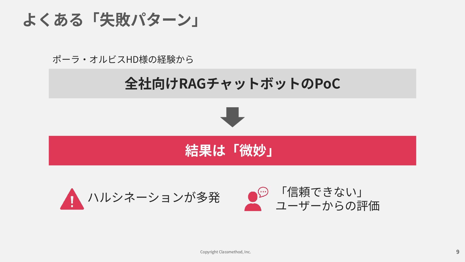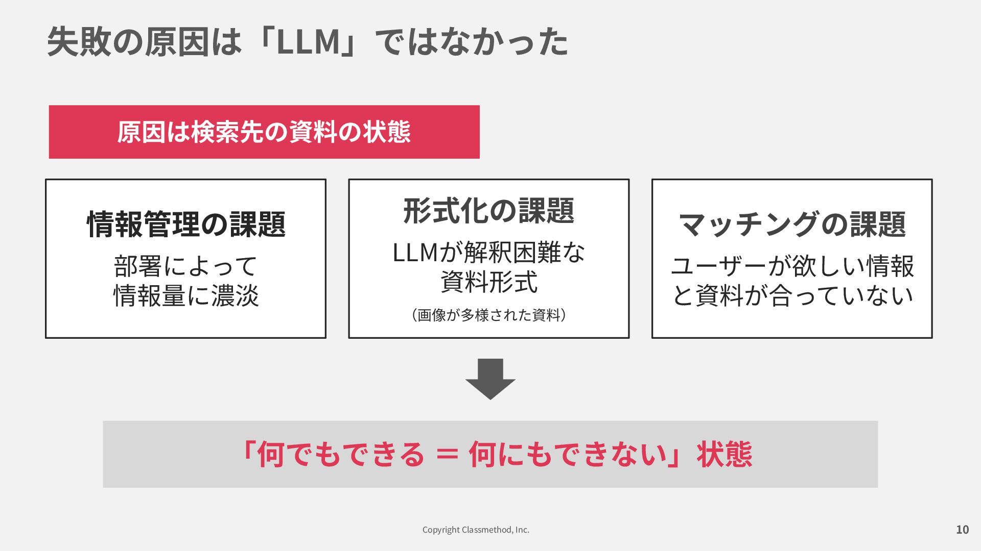 3. Copyright Classmethod, Inc. 10 失敗の原因は「LLM」ではなかった 原因は検索先の資料の状態 情報管理の課題 部署によって 情報量に濃淡 形式化の課題