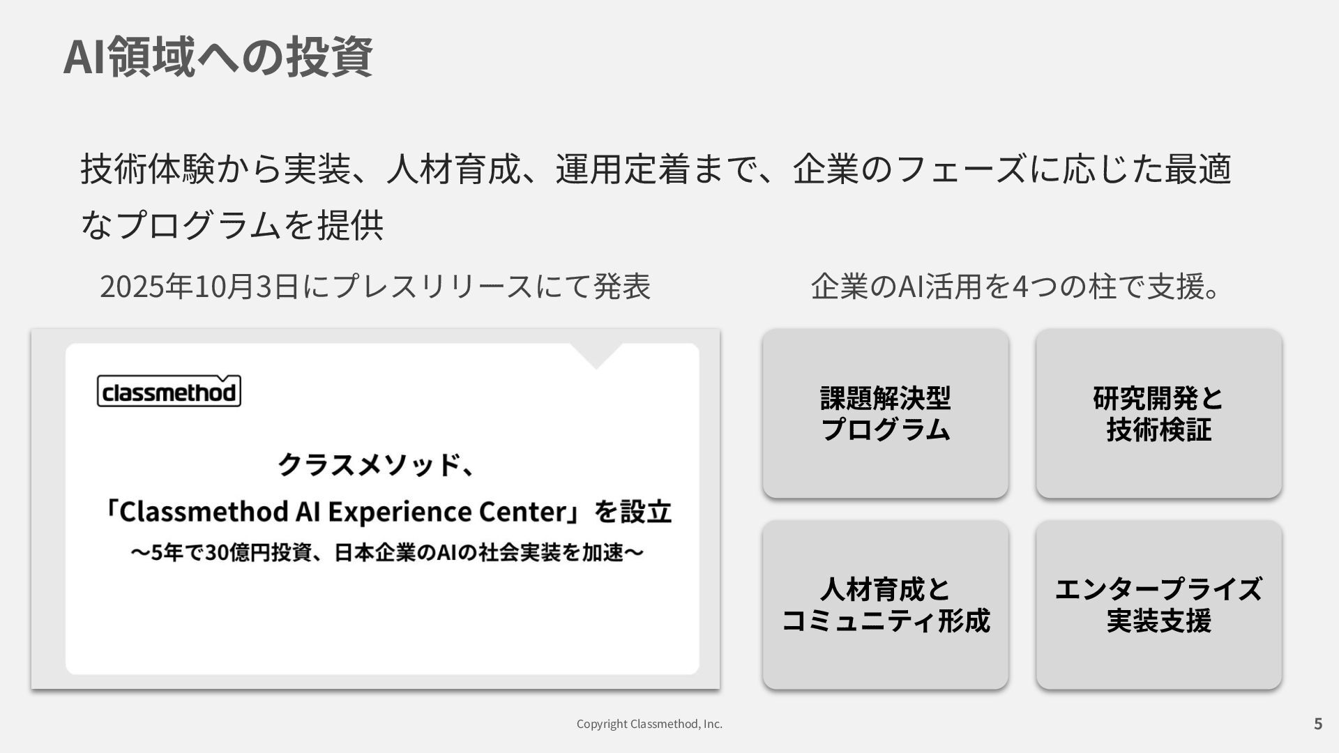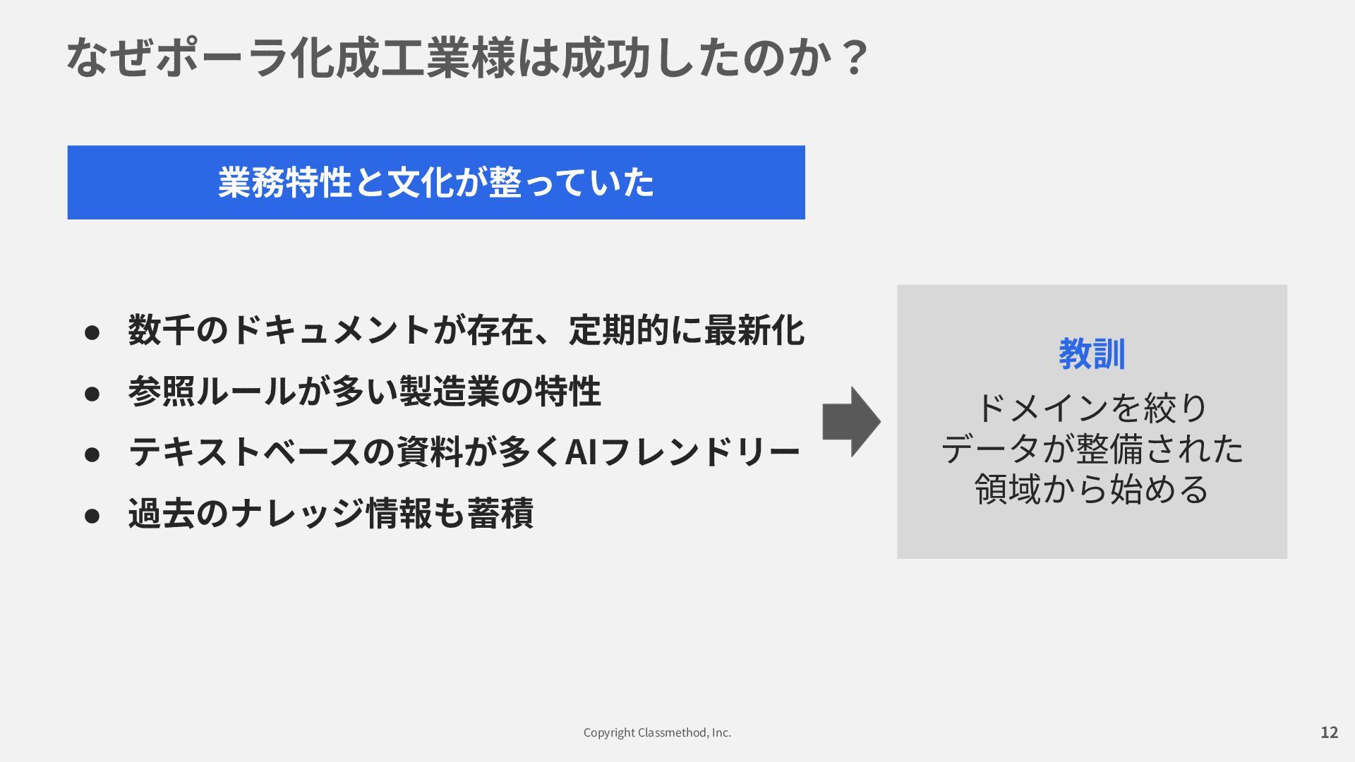 4. Copyright Classmethod, Inc. 12 なぜポーラ化成⼯業様は成功したのか? • 数千のドキュメントが存在、定期的に最新化 • 参照ルールが多い製造業の特性 •