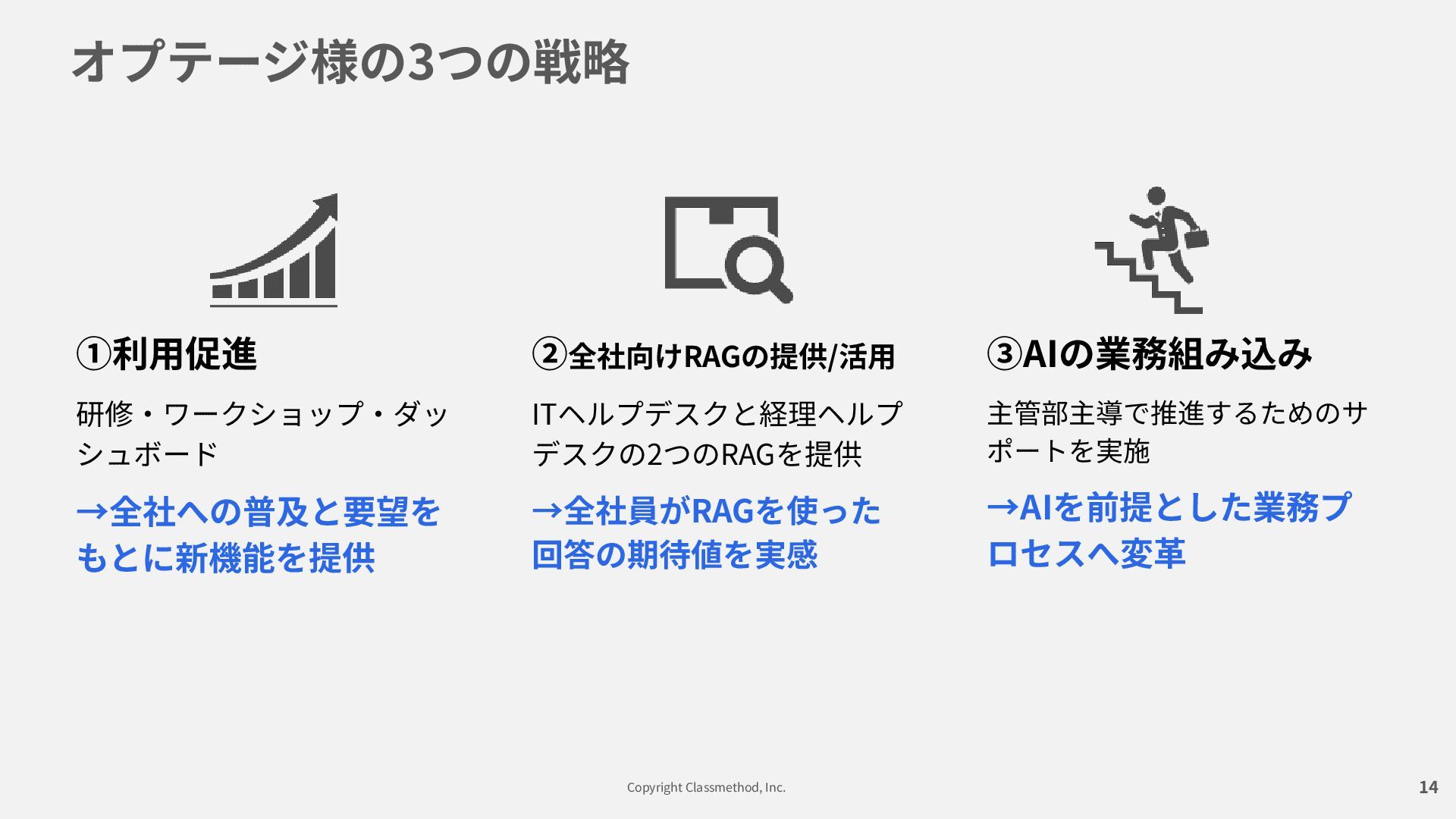 5. Copyright Classmethod, Inc. 14 オプテージ様の3つの戦略 ①利⽤促進 研修‧ワークショップ‧ダッ シュボード →全社への普及と要望を もとに新機能を提供