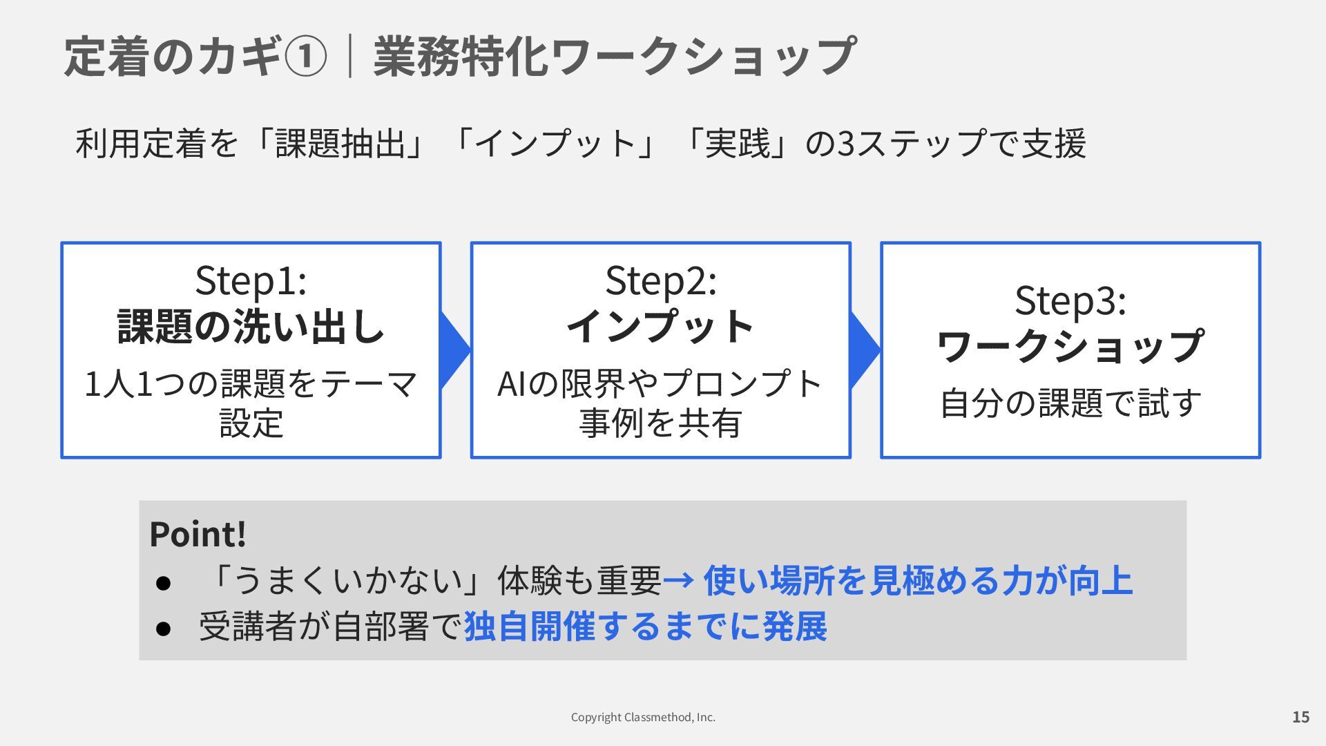 6. Copyright Classmethod, Inc. 15 定着のカギ①|業務特化ワークショップ Step1: 課題の洗い出し 1⼈1つの課題をテーマ 設定 Step3: