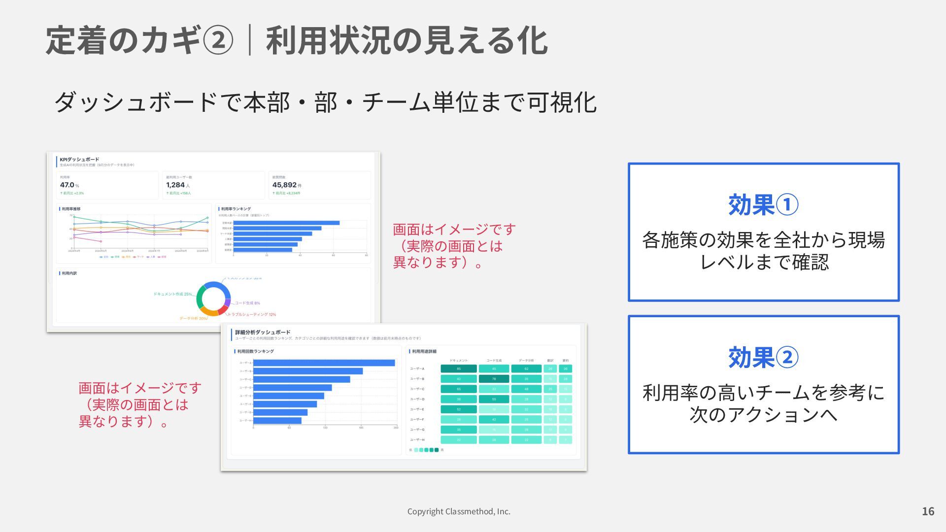 7. Copyright Classmethod, Inc. 16 定着のカギ②|利⽤状況の⾒える化 ダッシュボードで本部‧部‧チーム単位まで可視化 効果① 各施策の効果を全社から現場 レベルまで確認 効果②