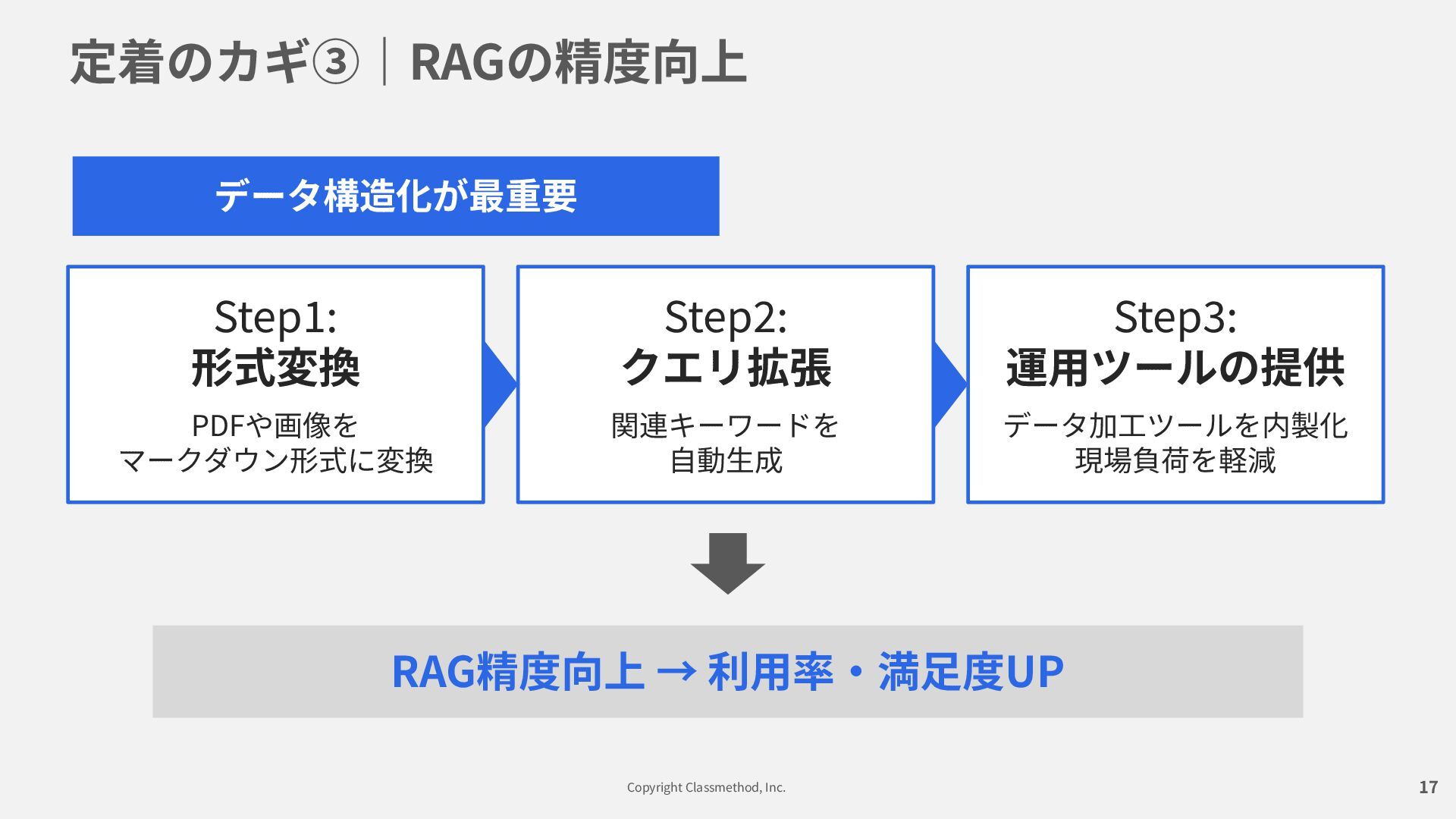 8. Copyright Classmethod, Inc. 17 定着のカギ③|RAGの精度向上 Step1: 形式変換 PDFや画像を マークダウン形式に変換 Step3: