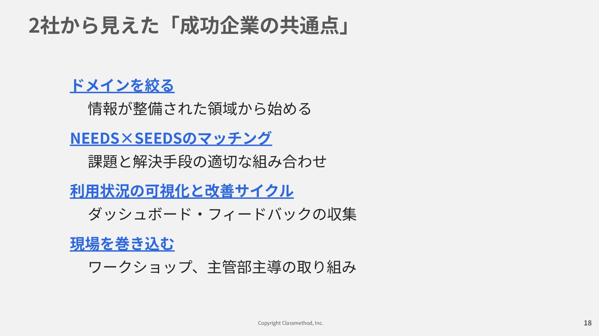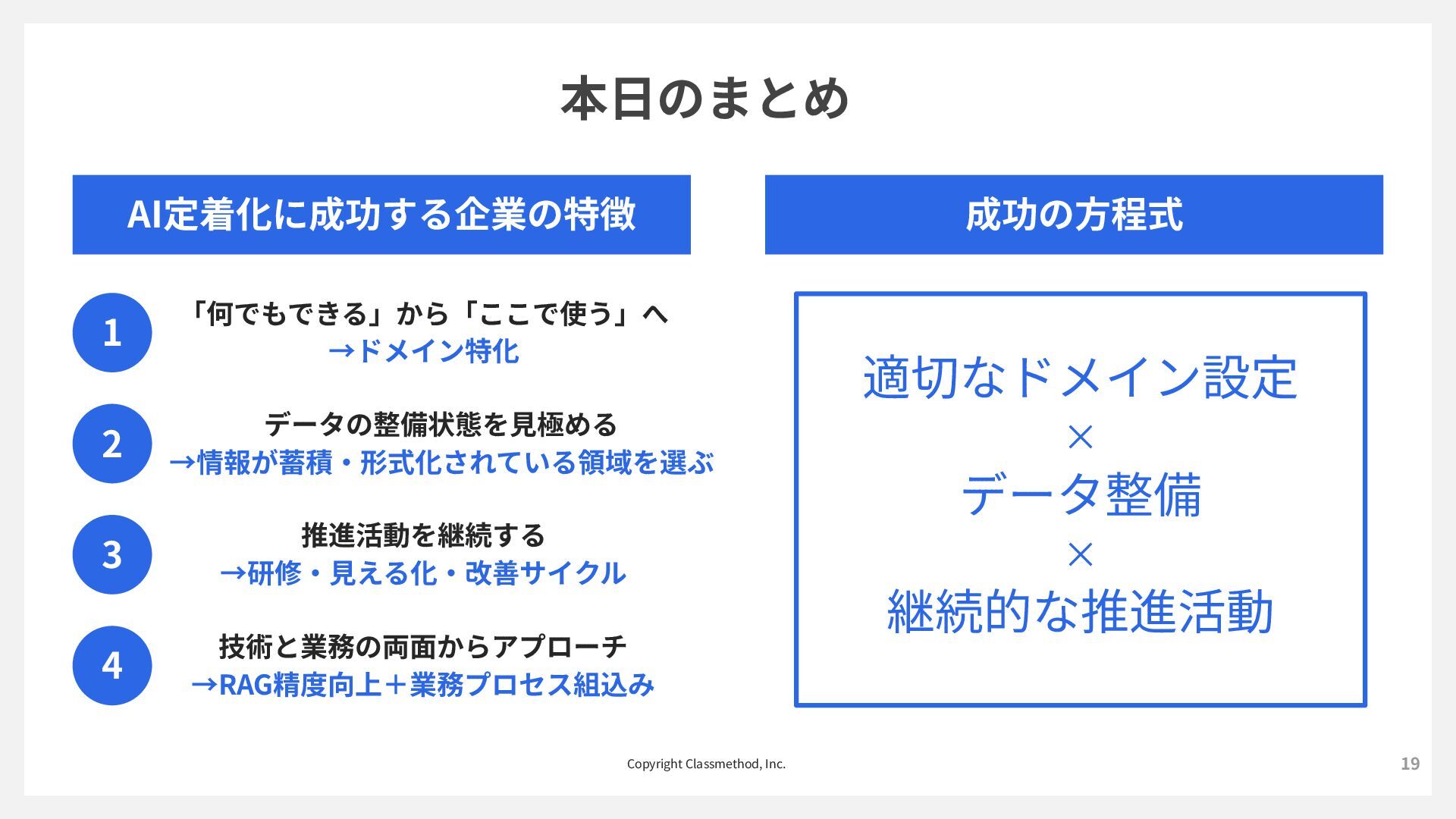 9. Copyright Classmethod, Inc. 本⽇のまとめ 19 AI定着化に成功する企業の特徴 成功の⽅程式 適切なドメイン設定 × データ整備