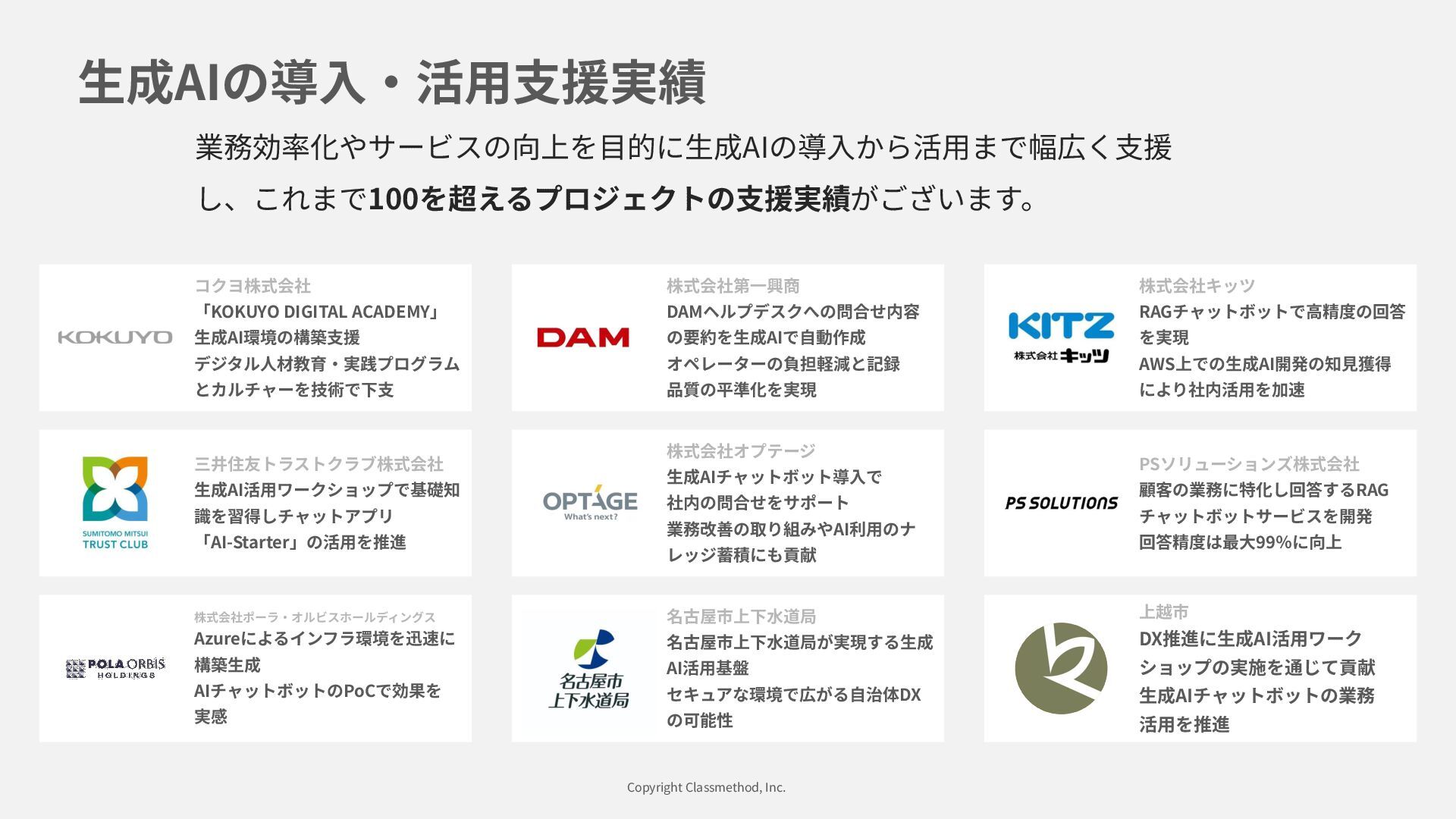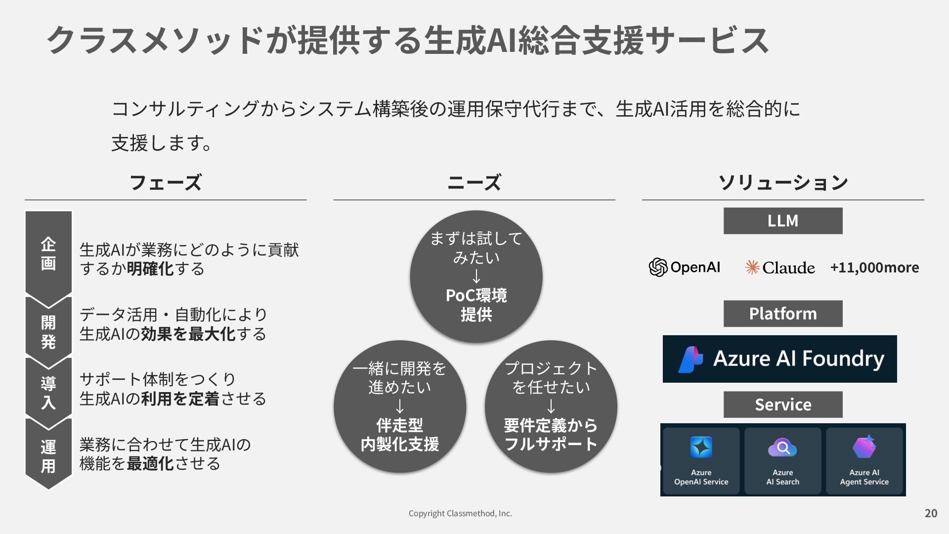 10. Copyright Classmethod, Inc. 20 クラスメソッドが提供する⽣成AI総合⽀援サービス コンサルティングからシステム構築後の運⽤保守代⾏まで、⽣成AI活⽤を総合的に ⽀援します。 フェーズ ニーズ +11,000more
