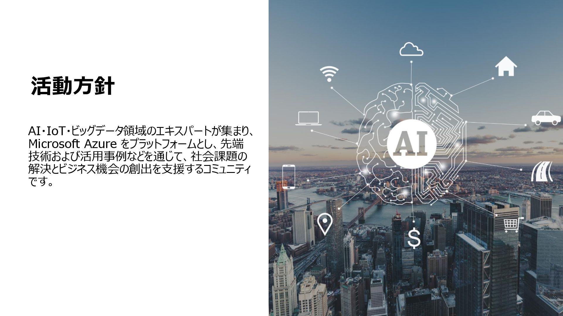 活動方針 AI・IoT・ビッグデータ領域のエキスパートが集まり、 Microsoft Azure をプラットフォームとし、先端 技術および活用事例などを通じて、社会課題の 解決とビジネス機会の創出を支援するコミュニティ です。