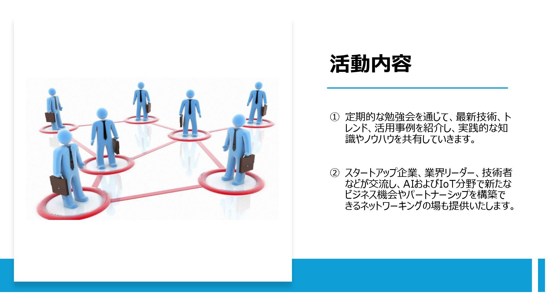 活動内容 ① 定期的な勉強会を通じて、最新技術、ト レンド、活用事例を紹介し、実践的な知 識やノウハウを共有していきます。 ② スタートアップ企業、業界リーダー、技術者 などが交流し、AIおよびIoT分野で新たな ビジネス機会やパートナーシップを構築で きるネットワーキングの場も提供いたします。