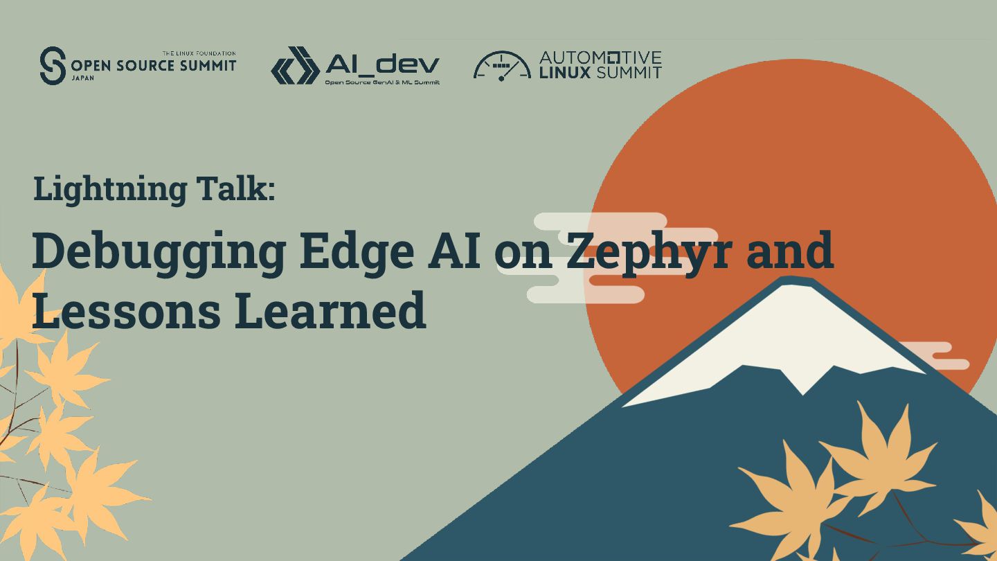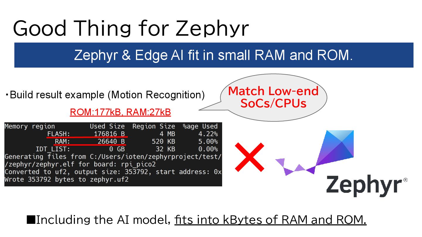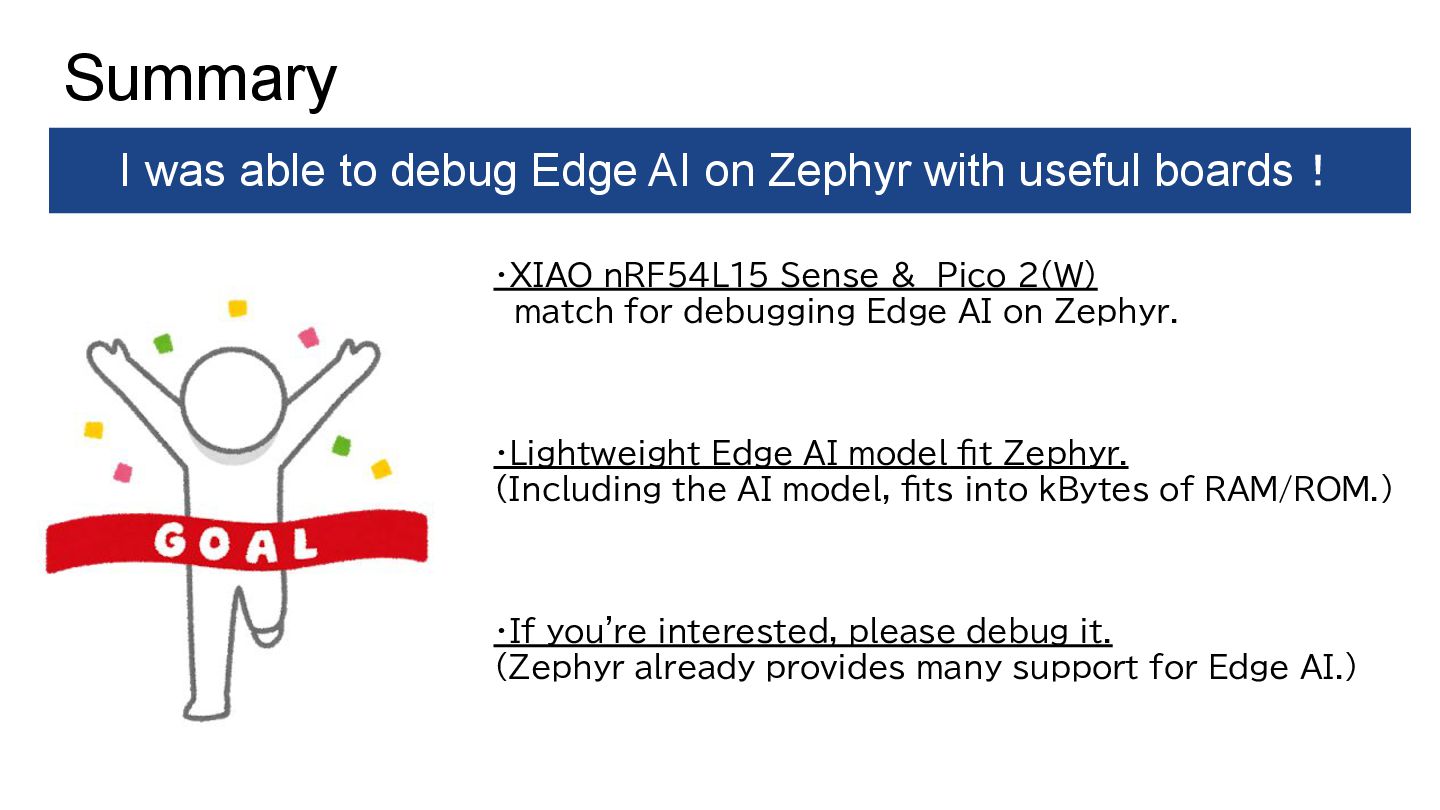 AI on Zephyr. ・Lightweight Edge AI model fit Zephyr. (Including the AI model, fits into kBytes of RAM/ROM.) ・If you're interested, please debug it. (Zephyr already provides many support for Edge AI.) Summary I was able to debug Edge AI on Zephyr with useful boards!