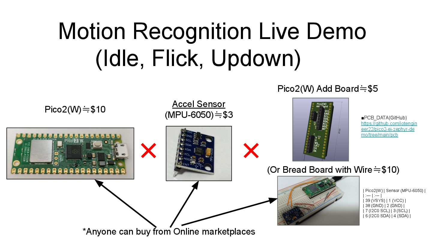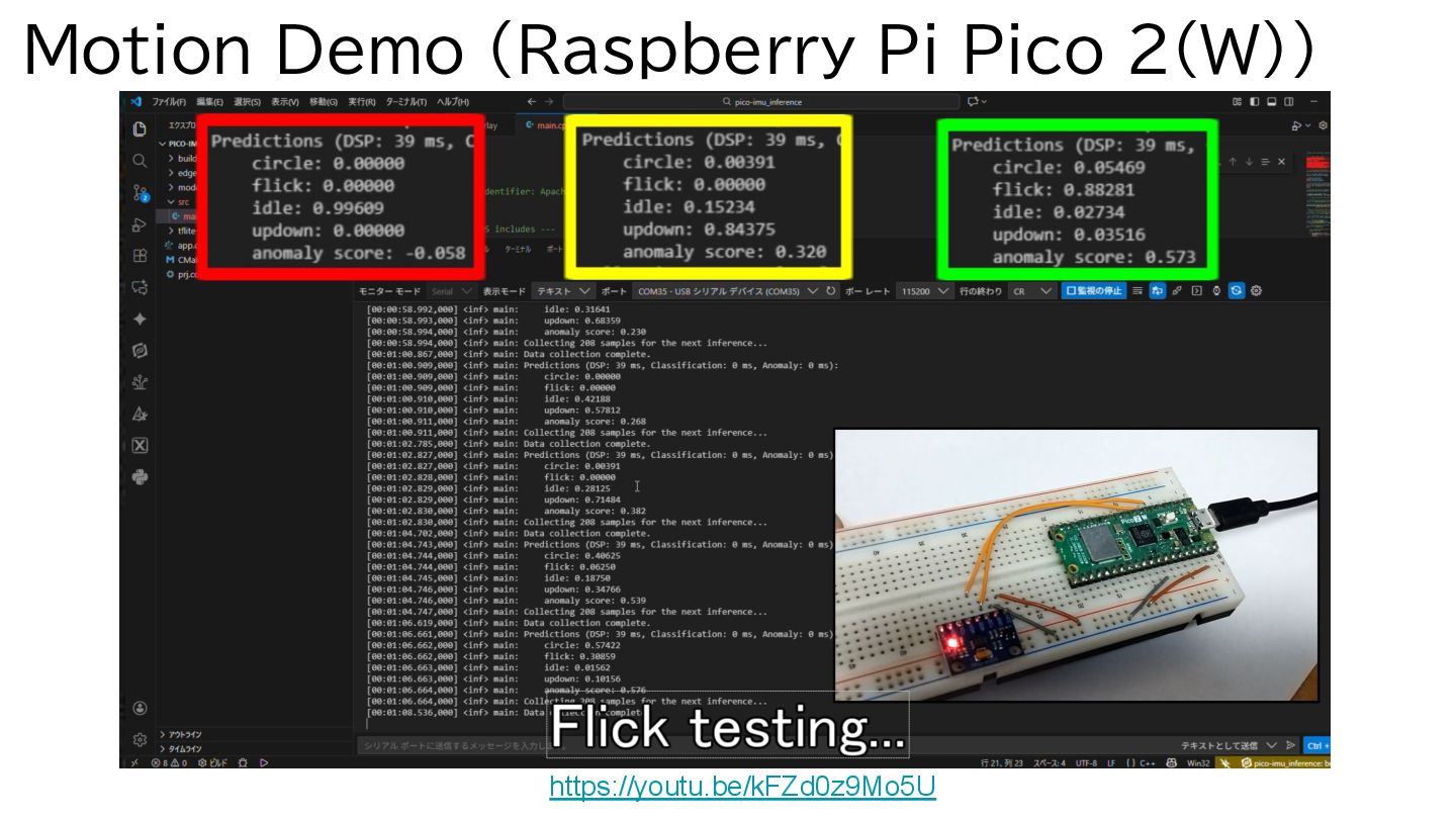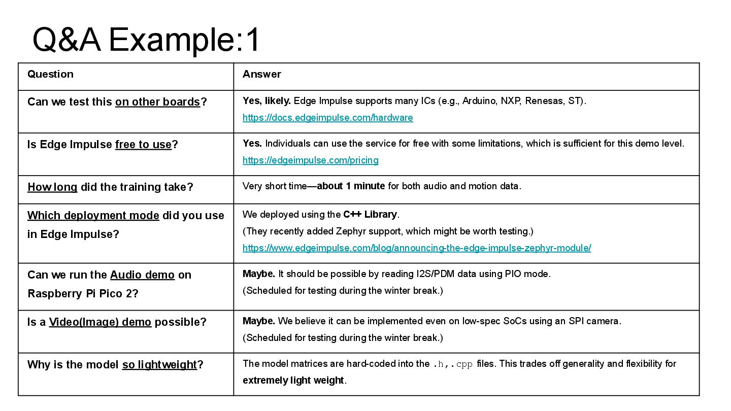 boards? Yes, likely. Edge Impulse supports many ICs (e.g., Arduino, NXP, Renesas, ST). https://docs.edgeimpulse.com/hardware Is Edge Impulse free to use? Yes. Individuals can use the service for free with some limitations, which is sufficient for this demo level. https://edgeimpulse.com/pricing How long did the training take? Very short time—about 1 minute for both audio and motion data. Which deployment mode did you use in Edge Impulse? We deployed using the C++ Library. (They recently added Zephyr support, which might be worth testing.) https://www.edgeimpulse.com/blog/announcing-the-edge-impulse-zephyr-module/ Can we run the Audio demo on Raspberry Pi Pico 2? Maybe. It should be possible by reading I2S/PDM data using PIO mode. (Scheduled for testing during the winter break.) Is a Video(Image) demo possible? Maybe. We believe it can be implemented even on low-spec SoCs using an SPI camera. (Scheduled for testing during the winter break.) Why is the model so lightweight? The model matrices are hard-coded into the .h,.cpp files. This trades off generality and flexibility for extremely light weight.