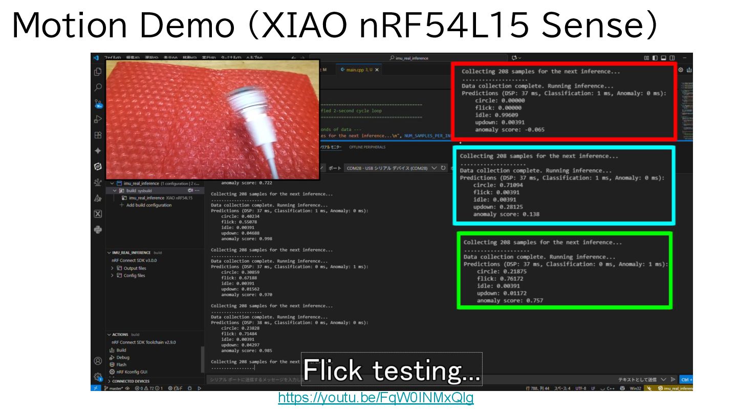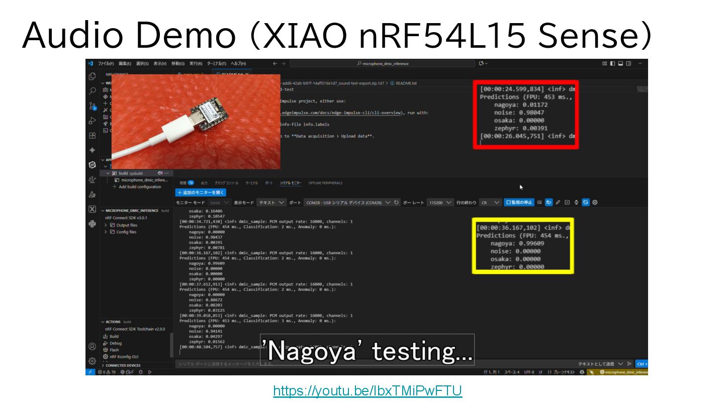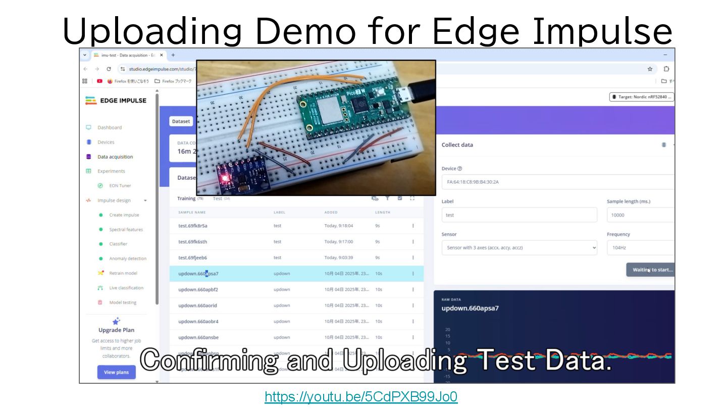 boards? Yes, likely. Edge Impulse supports many ICs (e.g., Arduino, NXP, Renesas, ST). https://docs.edgeimpulse.com/hardware Is Edge Impulse free to use? Yes. Individuals can use the service for free with some limitations, which is sufficient for this demo level. https://edgeimpulse.com/pricing How long did the training take? Very short time—about 1 minute for both audio and motion data. Which deployment mode did you use in Edge Impulse? We deployed using the C++ Library. (They recently added Zephyr support, which might be worth testing.) https://www.edgeimpulse.com/blog/announcing-the-edge-impulse-zephyr-module/ Can we run the Audio demo on Raspberry Pi Pico 2? Maybe. It should be possible by reading I2S/PDM data using PIO mode. (Scheduled for testing during the winter break.) Is a Video(Image) demo possible? Maybe. We believe it can be implemented even on low-spec SoCs using an SPI camera. (Scheduled for testing during the winter break.) Why is the model so lightweight? The model matrices are hard-coded into the .h,.cpp files. This trades off generality and flexibility for extremely light weight.