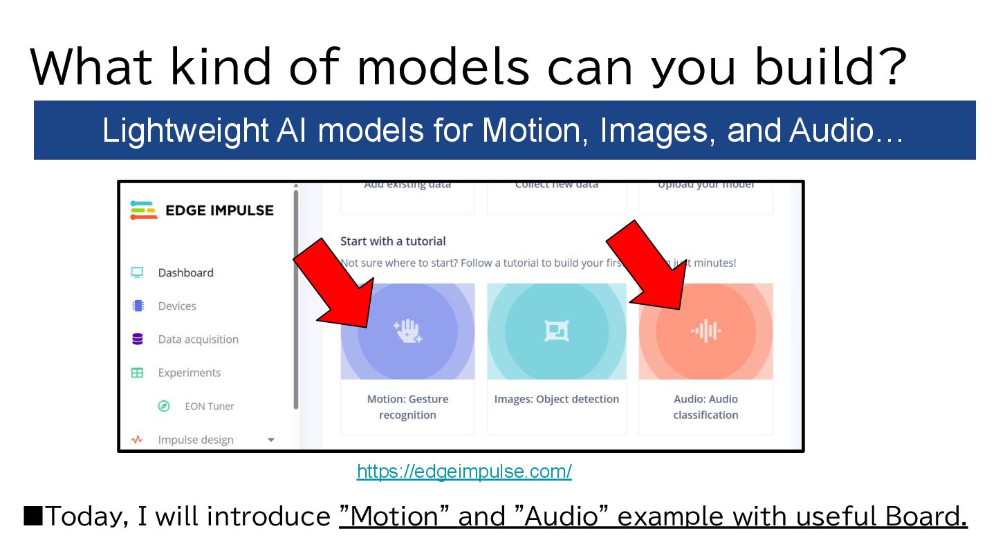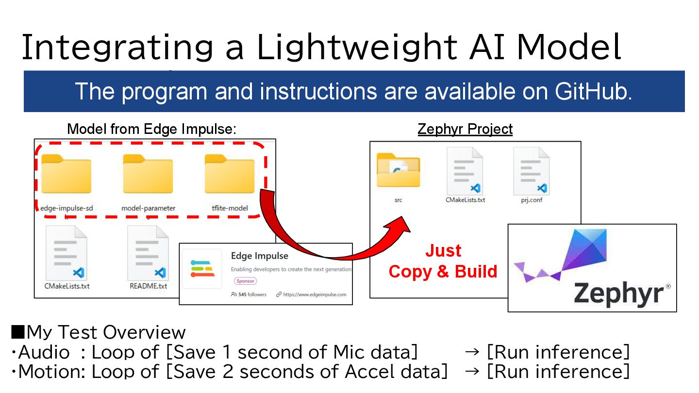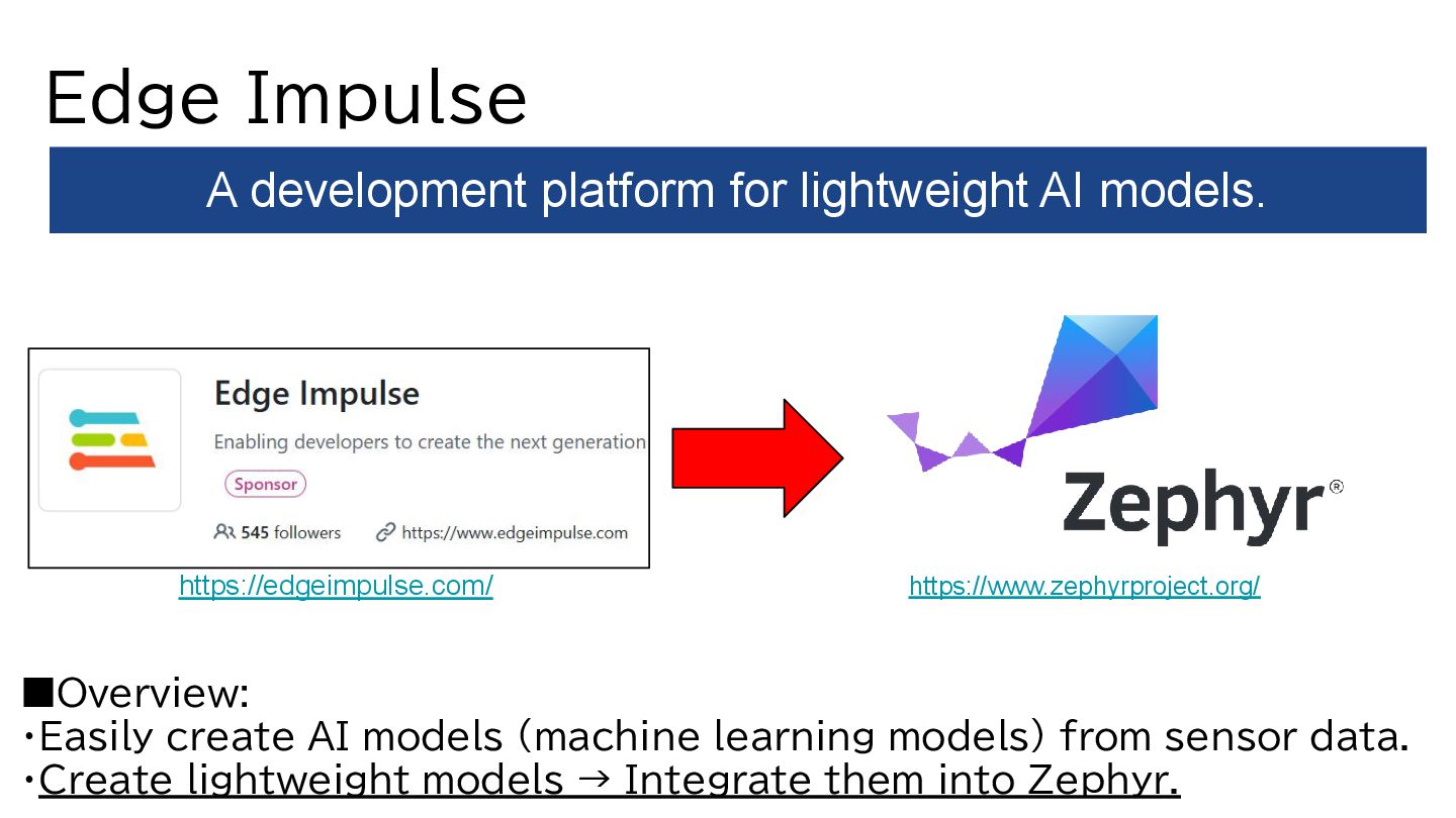 from sensor data. ・Create lightweight models → Integrate them into Zephyr. A development platform for lightweight AI models. https://www.zephyrproject.org/ https://edgeimpulse.com/