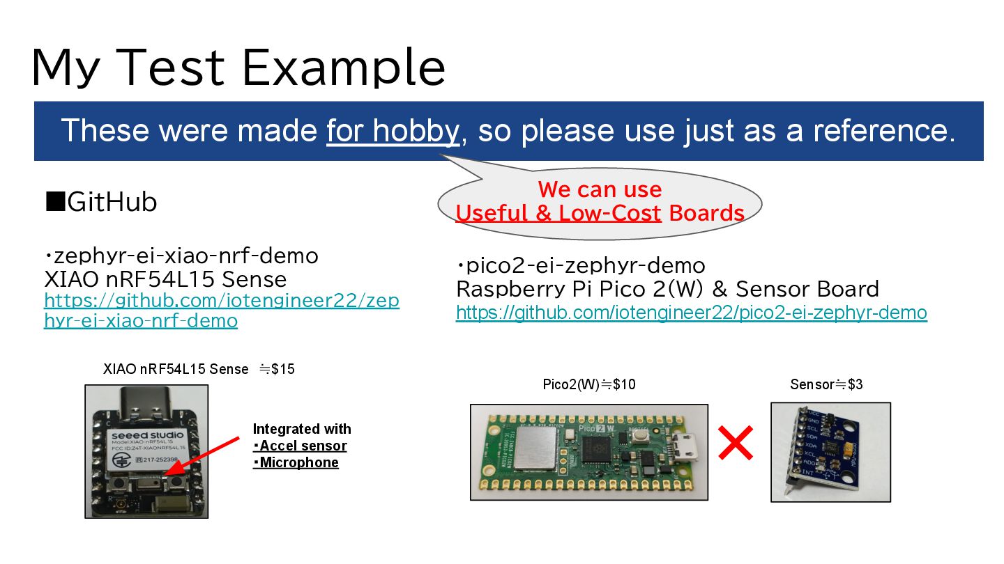 a reference. ・pico2-ei-zephyr-demo Raspberry Pi Pico 2(W) & Sensor Board https://github.com/iotengineer22/pico2-ei-zephyr-demo My Test Example ▪GitHub ・zephyr-ei-xiao-nrf-demo XIAO nRF54L15 Sense https://github.com/iotengineer22/zep hyr-ei-xiao-nrf-demo XIAO nRF54L15 Sense ≒$15 Integrated with ・Accel sensor ・Microphone We can use Useful & Low-Cost Boards + Sensor≒$3 Pico2(W)≒$10