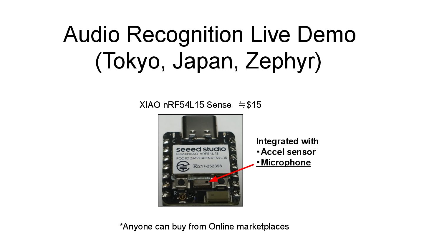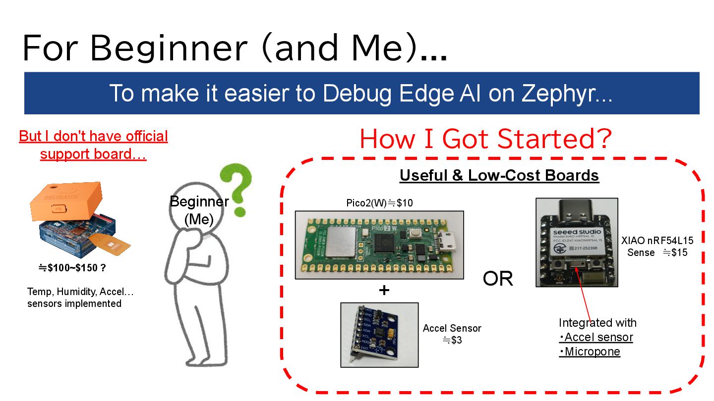Edge AI on Zephyr... But I don't have official support board… How I Got Started? Beginner (Me) Useful & Low-Cost Boards Temp, Humidity, Accel… sensors implemented Accel Sensor ≒$3 Pico2(W)≒$10 ≒$100~$150 ? OR XIAO nRF54L15 Sense ≒$15 Integrated with ・Accel sensor ・Micropone +