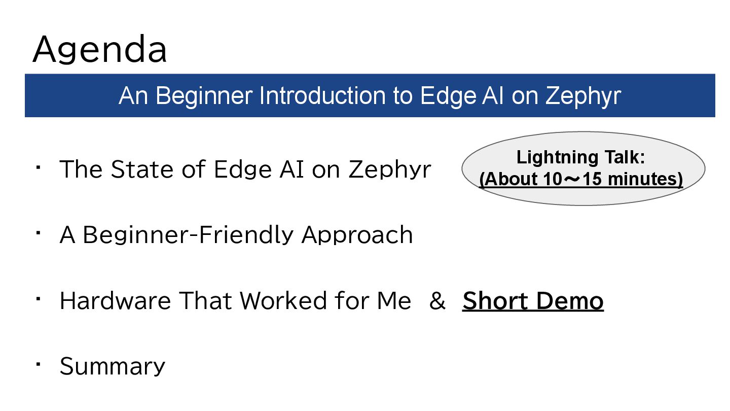 A Beginner-Friendly Approach • Hardware That Worked for Me & Short Demo • Summary An Beginner Introduction to Edge AI on Zephyr Lightning Talk: (About 10~15 minutes)