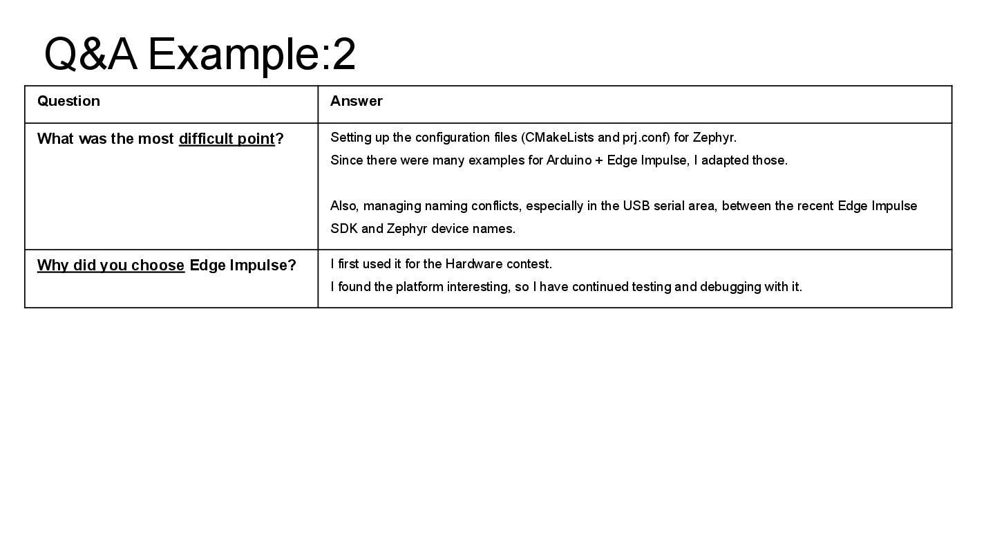 Setting up the configuration files (CMakeLists and prj.conf) for Zephyr. Since there were many examples for Arduino + Edge Impulse, I adapted those. Also, managing naming conflicts, especially in the USB serial area, between the recent Edge Impulse SDK and Zephyr device names. Why did you choose Edge Impulse? I first used it for the Hardware contest. I found the platform interesting, so I have continued testing and debugging with it.