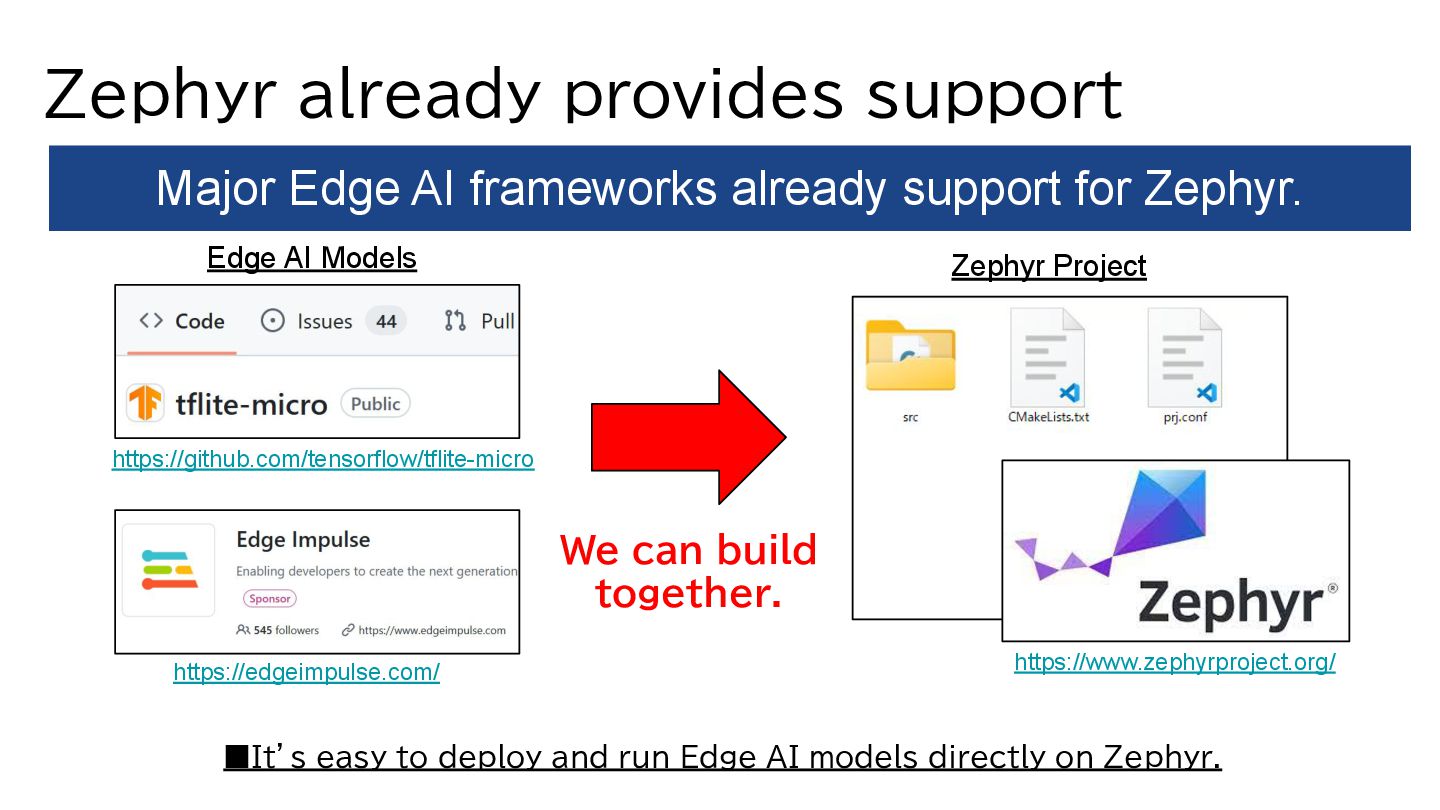 Edge AI models directly on Zephyr. Major Edge AI frameworks already support for Zephyr. https://edgeimpulse.com/ https://www.zephyrproject.org/ Just Build it all together. https://github.com/tensorflow/tflite-micro Zephyr Project We can build together. Edge AI Models