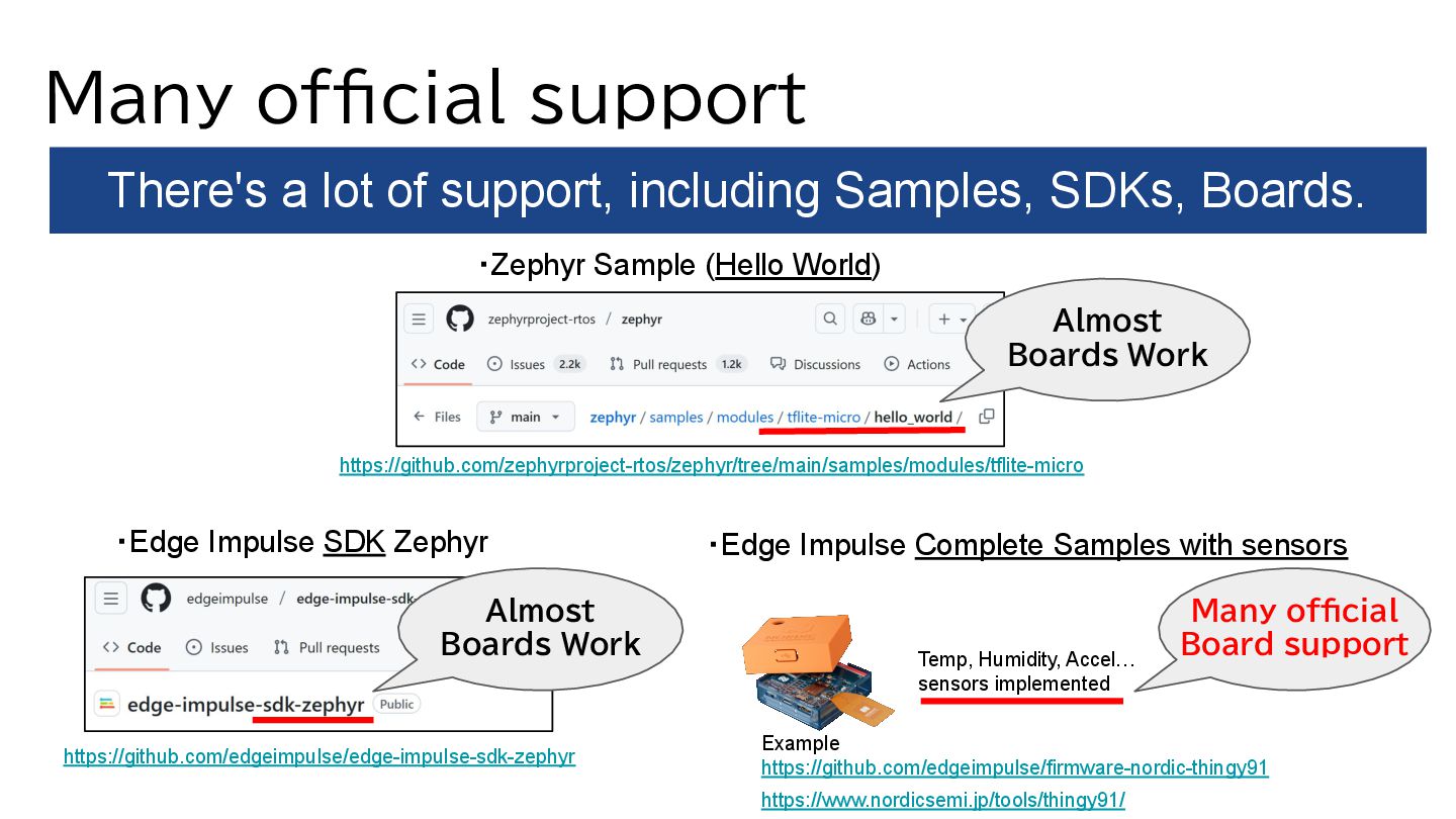 SDKs, Boards. ・Zephyr Sample (Hello World) ・Edge Impulse SDK Zephyr Almost Boards Work https://github.com/zephyrproject-rtos/zephyr/tree/main/samples/modules/tflite-micro https://github.com/edgeimpulse/edge-impulse-sdk-zephyr ・Edge Impulse Complete Samples with sensors Example https://github.com/edgeimpulse/firmware-nordic-thingy91 Almost Boards Work Many official Board support Temp, Humidity, Accel… sensors implemented https://www.nordicsemi.jp/tools/thingy91/