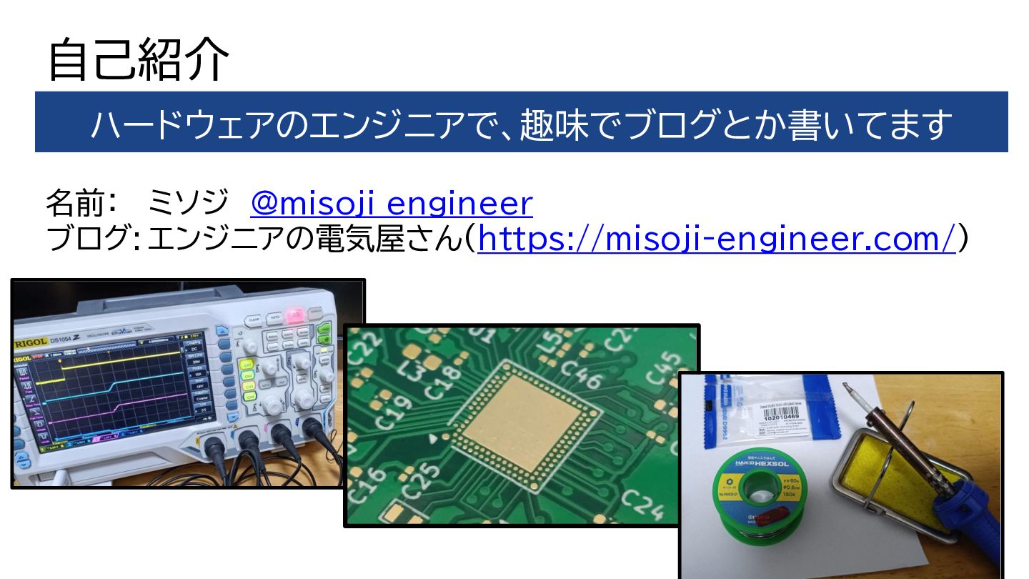 自己紹介 名前: ミソジ @misoji_engineer ブログ: エンジニアの電気屋さん(https://misoji-engineer.com/) ハードウェアのエンジニアで、趣味でブログとか書いてます