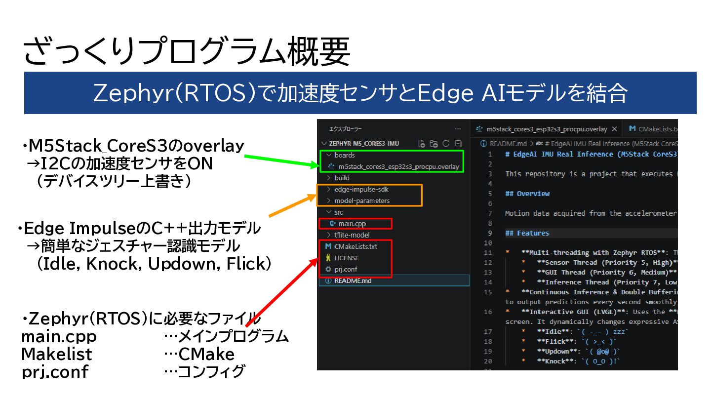 ざっくりプログラム概要 Zephyr(RTOS)で加速度センサとEdge AIモデルを結合 ・Zephyr(RTOS)に必要なファイル main.cpp …メインプログラム Makelist …CMake prj.conf …コンフィグ