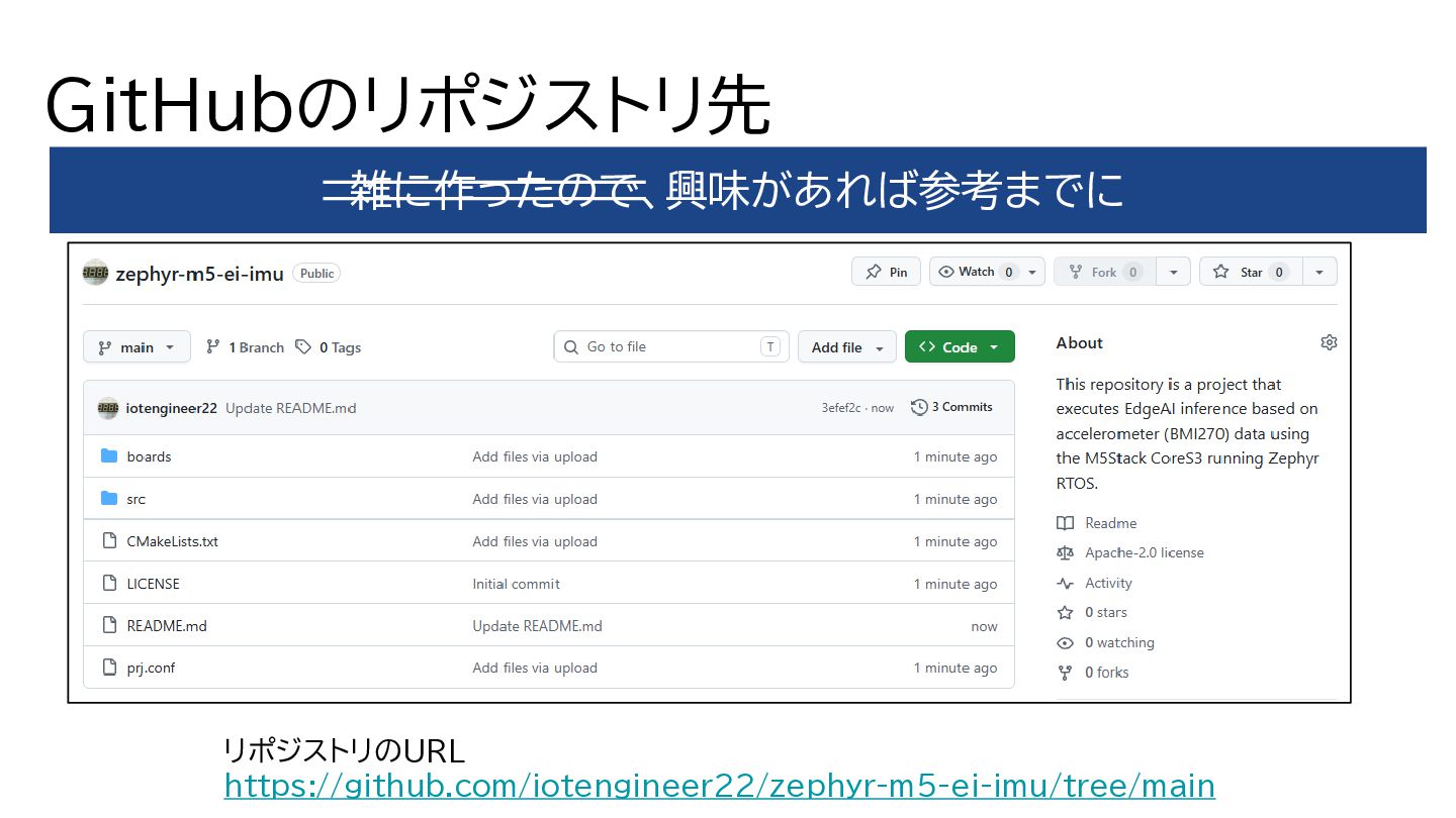 GitHubのリポジストリ先 雑に作ったので、興味があれば参考までに リポジストリのURL https://github.com/iotengineer22/zephyr-m5-ei-imu/tree/main