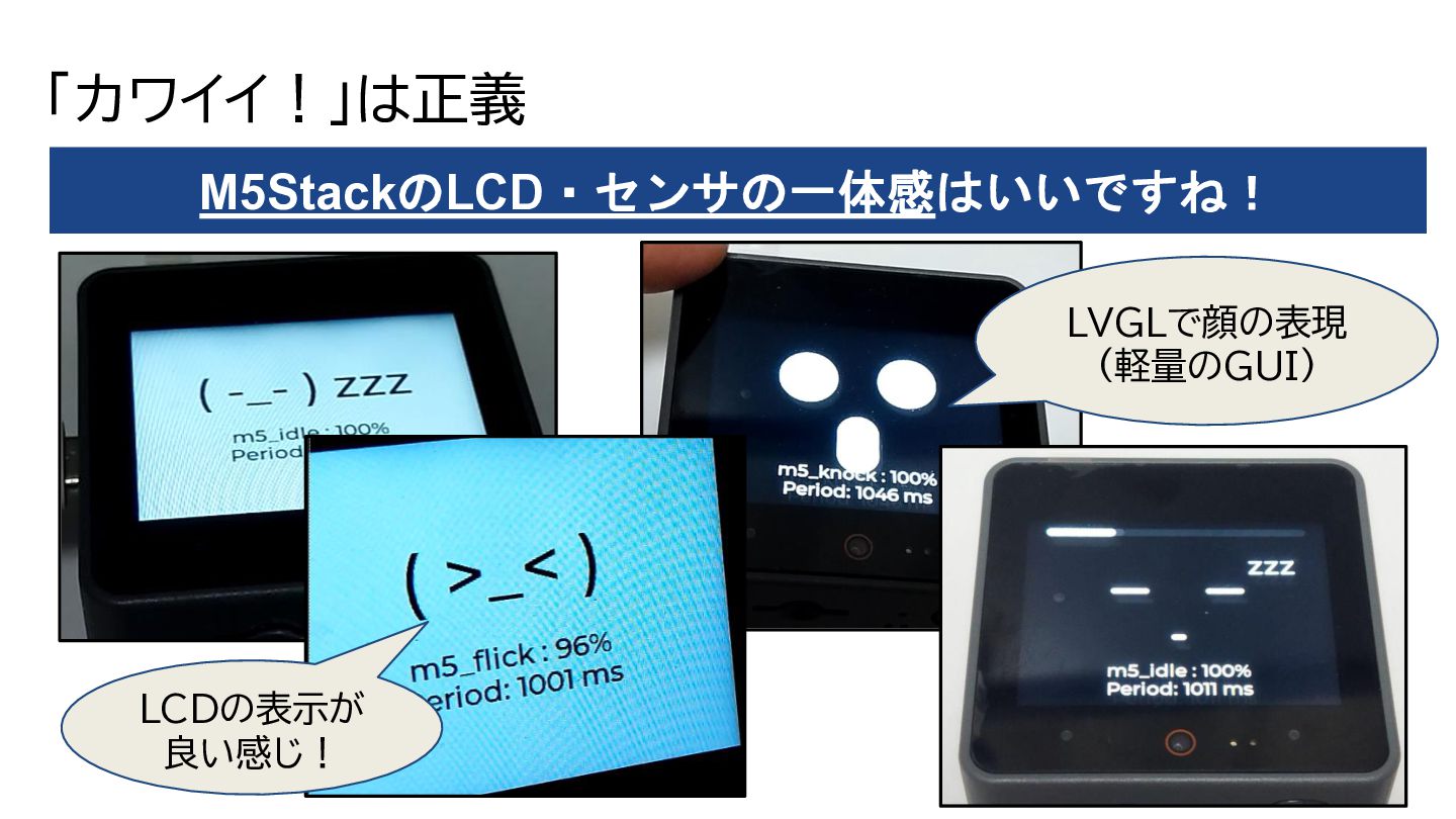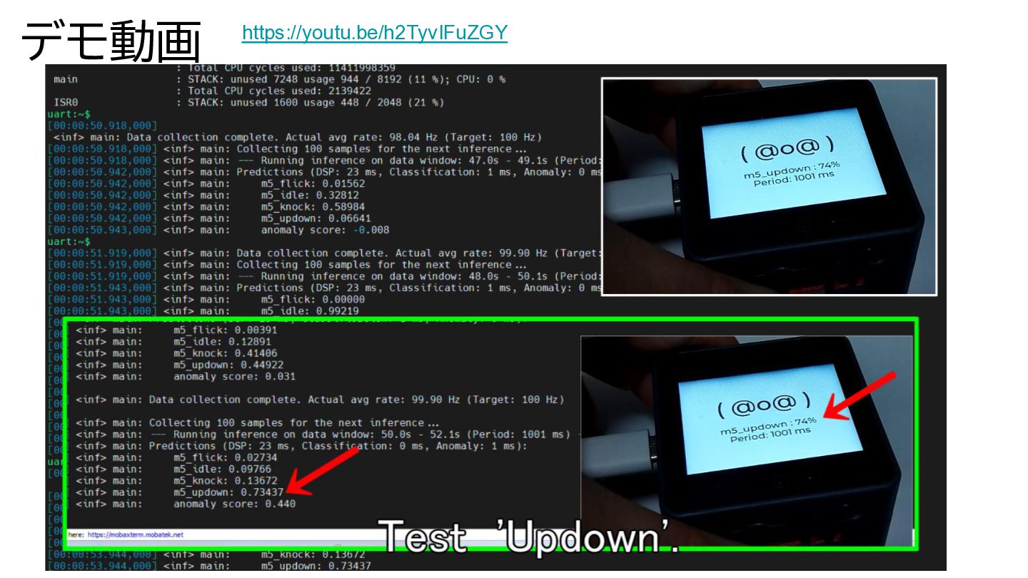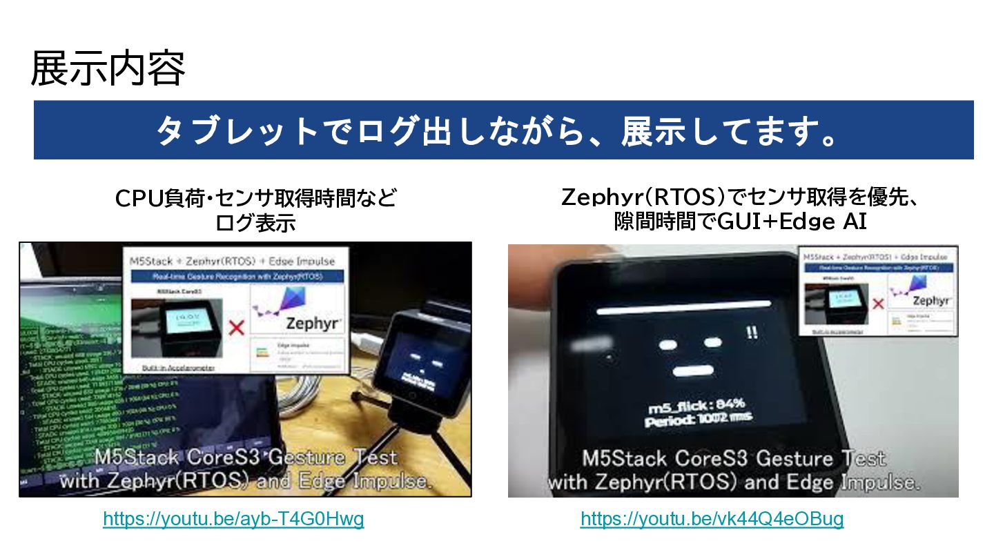 展示内容 タブレットでログ出しながら、展示してます。 https://youtu.be/ayb-T4G0Hwg CPU負荷・センサ取得時間など ログ表示 Zephyr(RTOS)でセンサ取得を優先、 隙間時間でGUI+Edge AI https://youtu.be/vk44Q4eOBug
