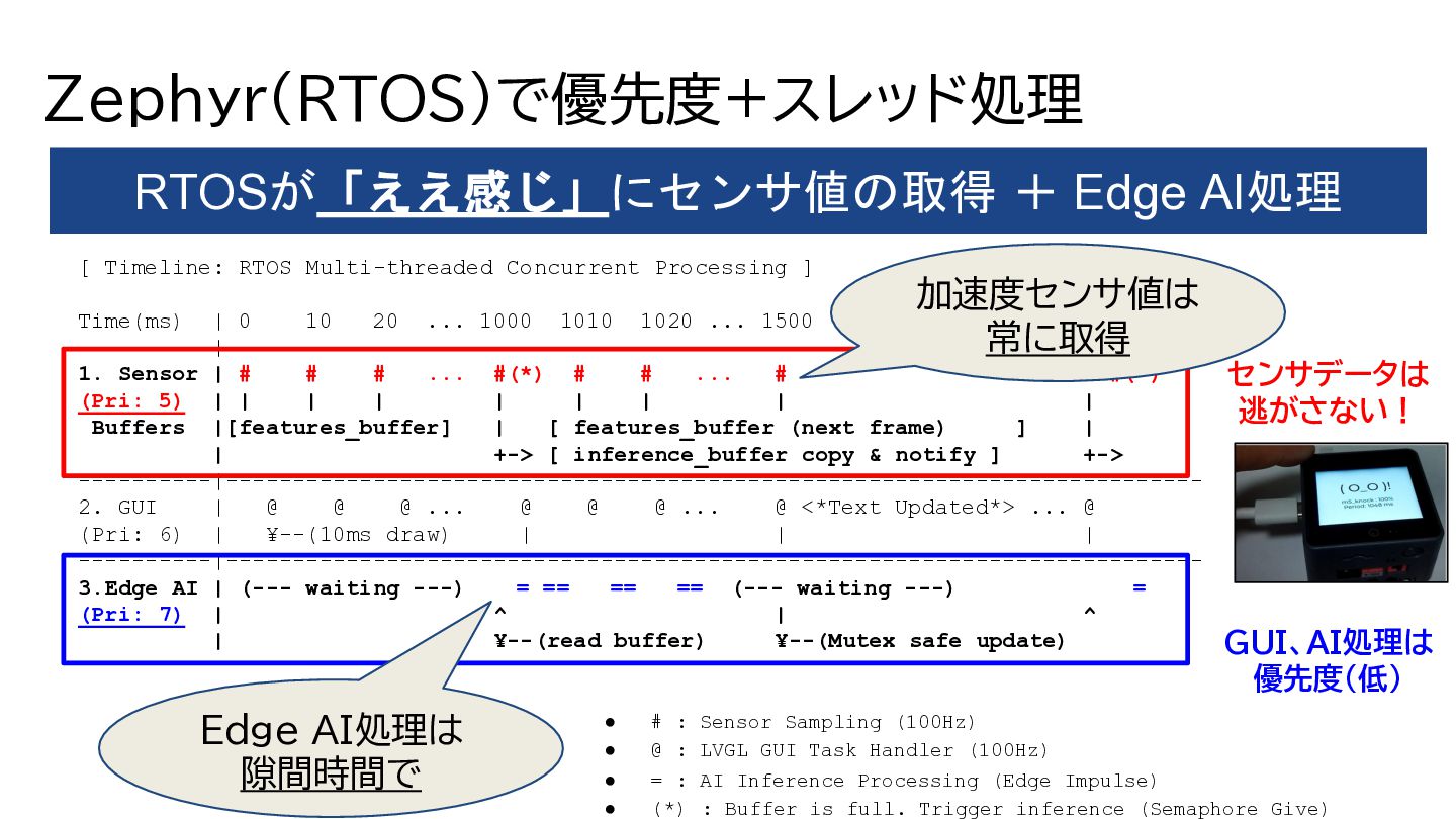 Processing ] Time(ms) | 0 10 20 ... 1000 1010 1020 ... 1500 ... 2000 ----------|------------------------------------------------------------------------- 1. Sensor | # # # ... #(*) # # ... # ... #(*) (Pri: 5) | | | | | | | | | Buffers |[features_buffer] | [ features_buffer (next frame) ] | | +-> [ inference_buffer copy & notify ] +-> ----------|------------------------------------------------------------------------- 2. GUI | @ @ @ ... @ @ @ ... @ <*Text Updated*> ... @ (Pri: 6) | ¥--(10ms draw) | | | ----------|------------------------------------------------------------------------- 3.Edge AI | (--- waiting ---) = == == == (--- waiting ---) = (Pri: 7) | ^ | ^ | ¥--(read buffer) ¥--(Mutex safe update) • # : Sensor Sampling (100Hz) • @ : LVGL GUI Task Handler (100Hz) • = : AI Inference Processing (Edge Impulse) • (*) : Buffer is full. Trigger inference (Semaphore Give) センサデータは 逃がさない! 加速度センサ値は 常に取得 Edge AI処理は 隙間時間で GUI、AI処理は 優先度(低)