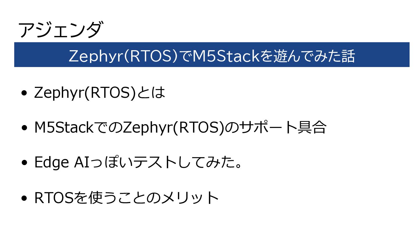 アジェンダ • Zephyr(RTOS)とは • M5StackでのZephyr(RTOS)のサポート具合 • Edge AIっぽいテストしてみた。 • RTOSを使うことのメリット