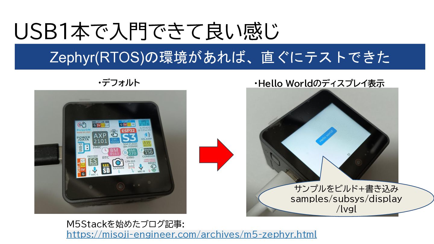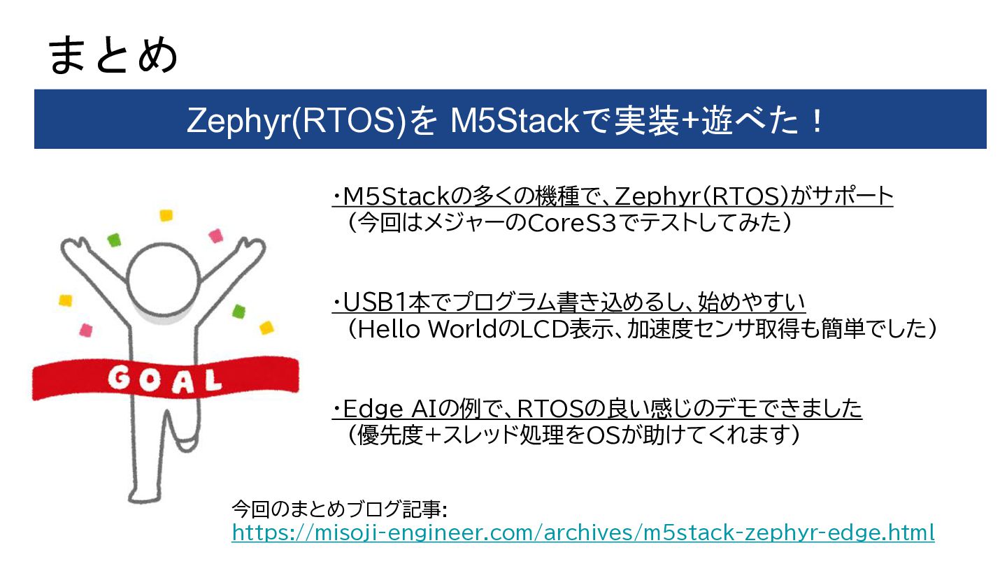 ・M5Stackの多くの機種で、Zephyr(RTOS)がサポート (今回はメジャーのCoreS3でテストしてみた) ・USB1本でプログラム書き込めるし、始めやすい (Hello WorldのLCD表示、加速度センサ取得も簡単でした) ・Edge AIの例で、RTOSの良い感じのデモできました (優先度+スレッド処理をOSが助けてくれます) まとめ Zephyr(RTOS)を