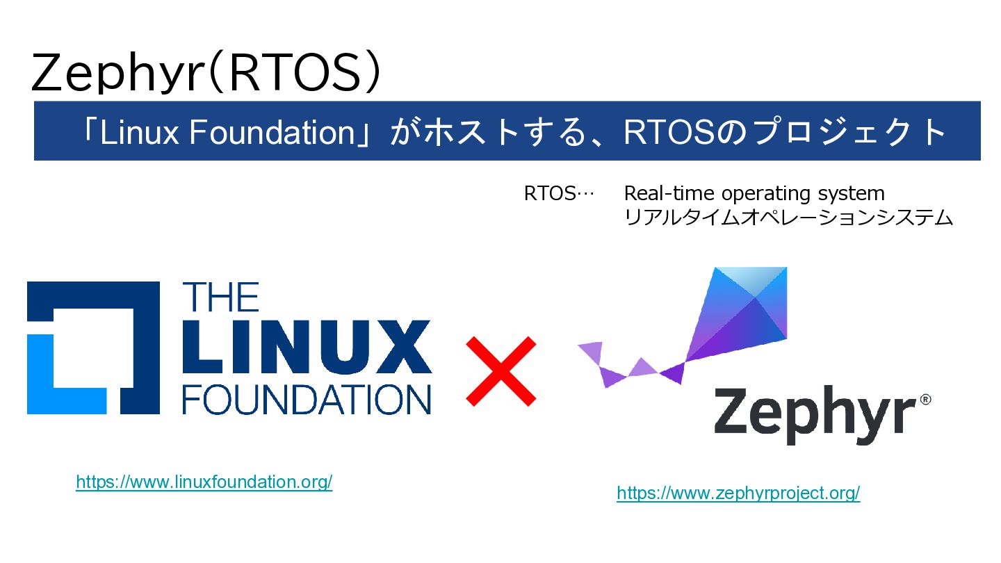 Zephyr(RTOS) 「Linux Foundation」がホストする、RTOSのプロジェクト https://www.zephyrproject.org/ RTOS… Real-time operating system リアルタイムオペレーションシステム https://www.linuxfoundation.org/