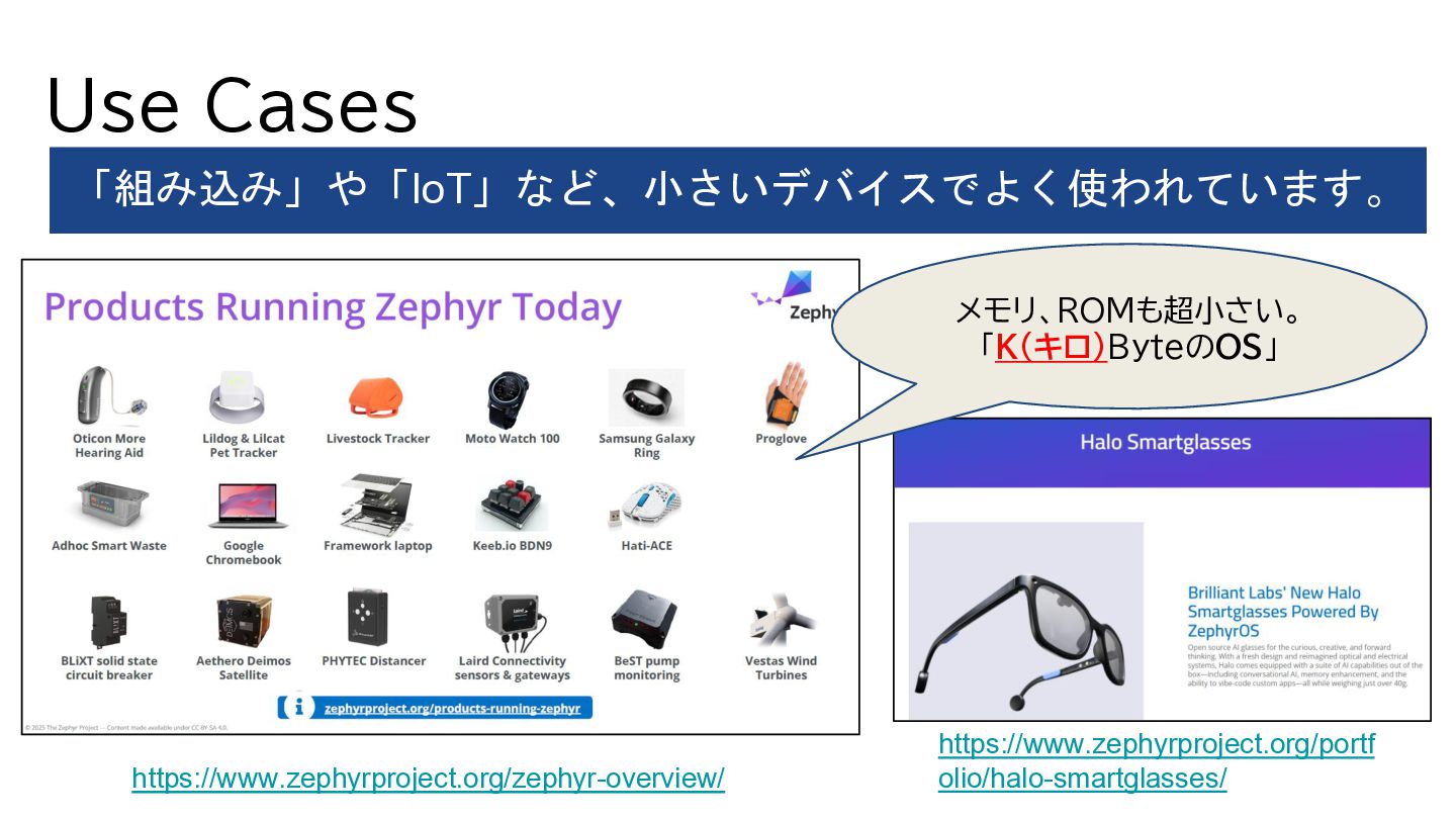 Use Cases ? 「組み込み」や「IoT」など、小さいデバイスでよく使われています。 https://www.zephyrproject.org/zephyr-overview/ https://www.zephyrproject.org/portf olio/halo-smartglasses/ メモリ、ROMも超小さい。 「K(キロ)ByteのOS」