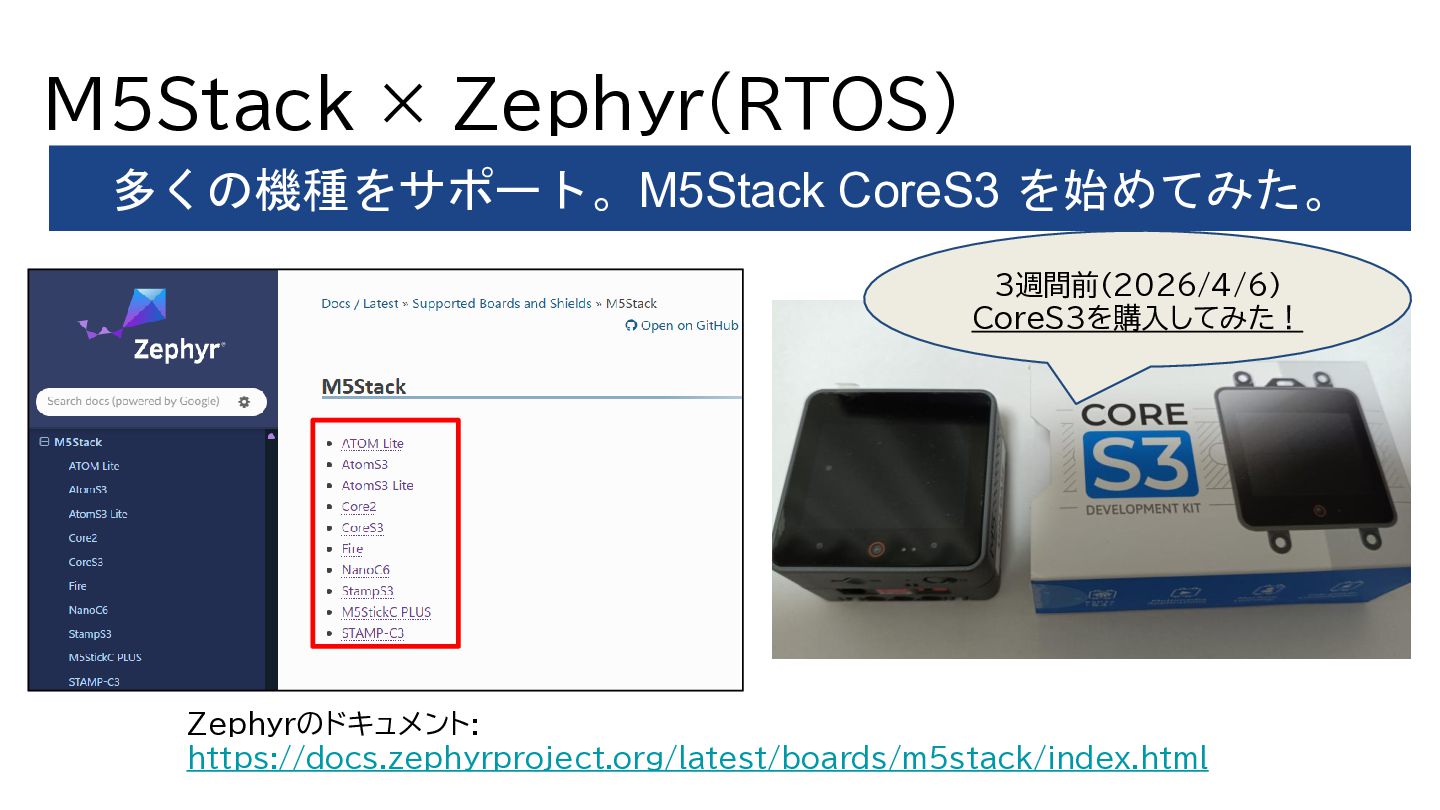 M5Stack × Zephyr(RTOS) 多くの機種をサポート。M5Stack CoreS3 を始めてみた。 Zephyrのドキュメント: https://docs.zephyrproject.org/latest/boards/m5stack/index.html 3週間前(2026/4/6) CoreS3を購入してみた!