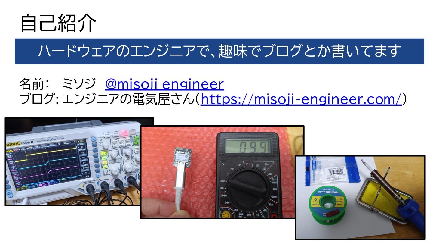 自己紹介 名前: ミソジ @misoji_engineer ブログ: エンジニアの電気屋さん(https://misoji-engineer.com/) ハードウェアのエンジニアで、趣味でブログとか書いてます