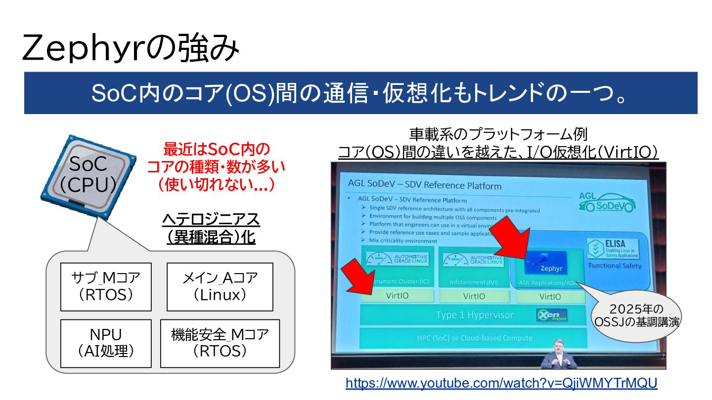 (Linux) サブ_Mコア (RTOS) 機能安全_Mコア (RTOS) NPU (AI処理) 最近はSoC内の コアの種類・数が多い (使い切れない...) 2025年の OSSJの基調講演