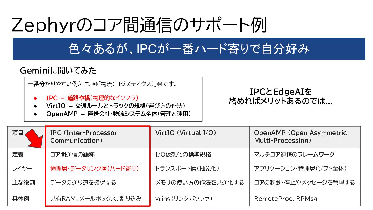 Zephyrのコア間通信のサポート例 色々あるが、IPCが一番ハード寄りで自分好み 項目 IPC (Inter-Processor Communication) VirtIO (Virtual I/O) OpenAMP