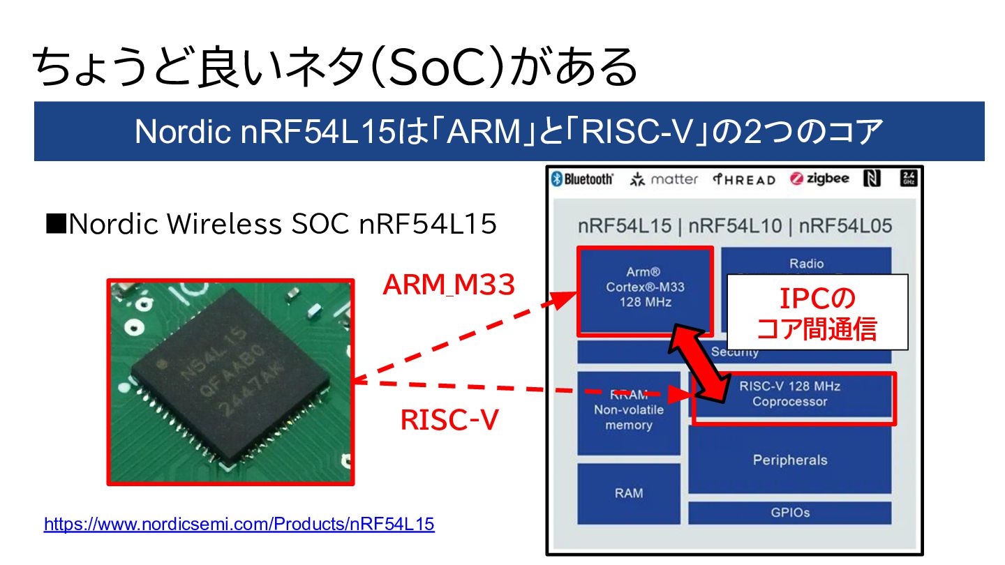 ちょうど良いネタ(SoC)がある ▪Nordic Wireless SOC nRF54L15 Nordic nRF54L15は「ARM」と「RISC-V」の2つのコア https://www.nordicsemi.com/Products/nRF54L15 IPCの コア間通信