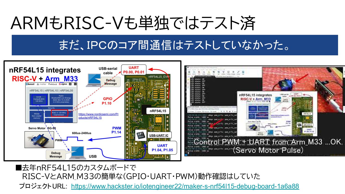 ARMもRISC-Vも単独ではテスト済 まだ、IPCのコア間通信はテストしていなかった。 ▪去年nRF54L15のカスタムボードで RISC-VとARM_M33の簡単な(GPIO・UART・PWM)動作確認はしていた プロジェクトURL: https://www.hackster.io/iotengineer22/maker-s-nrf54l15-debug-board-1a6a88