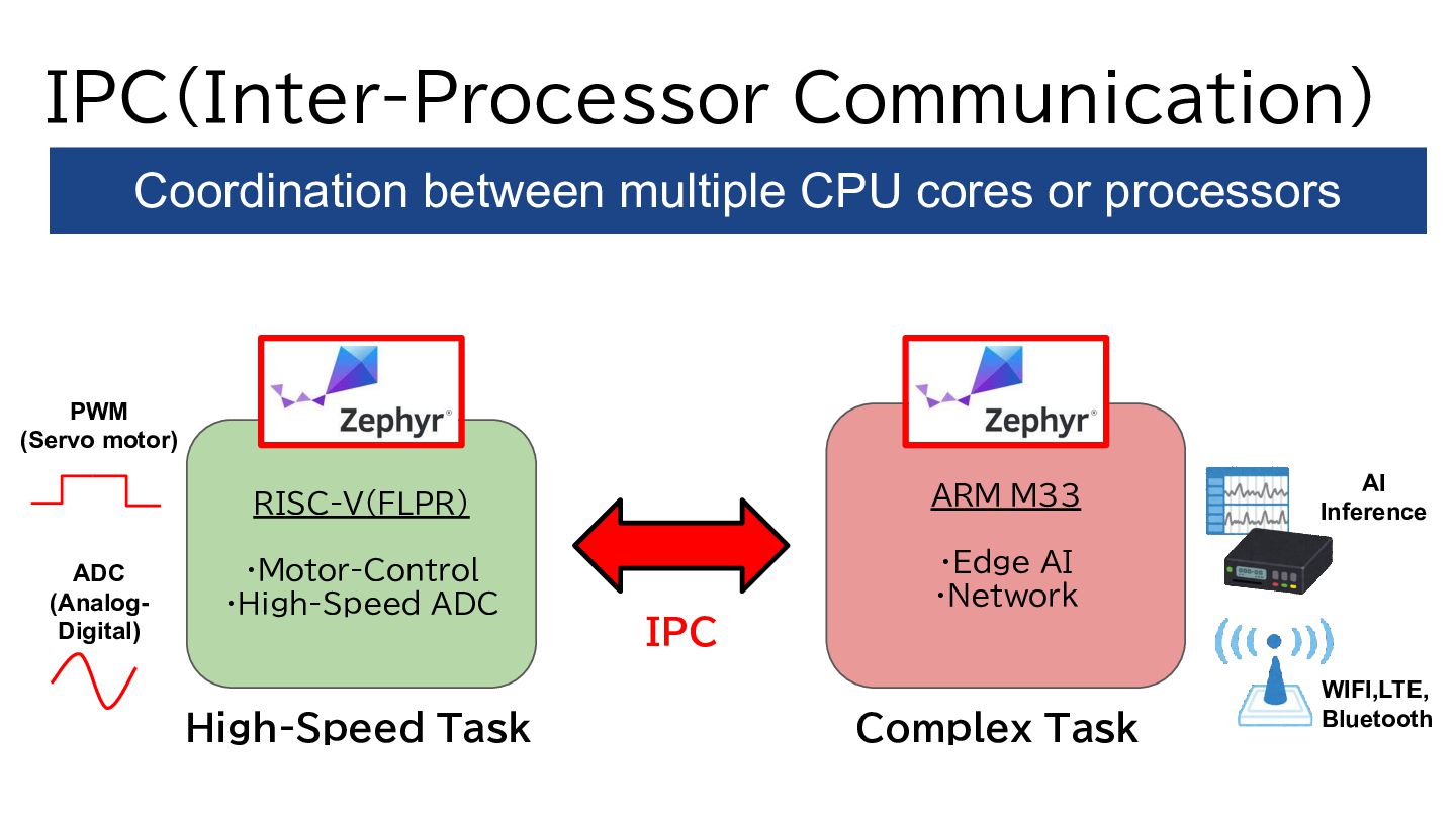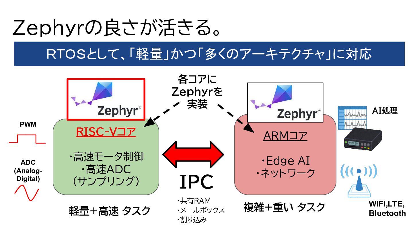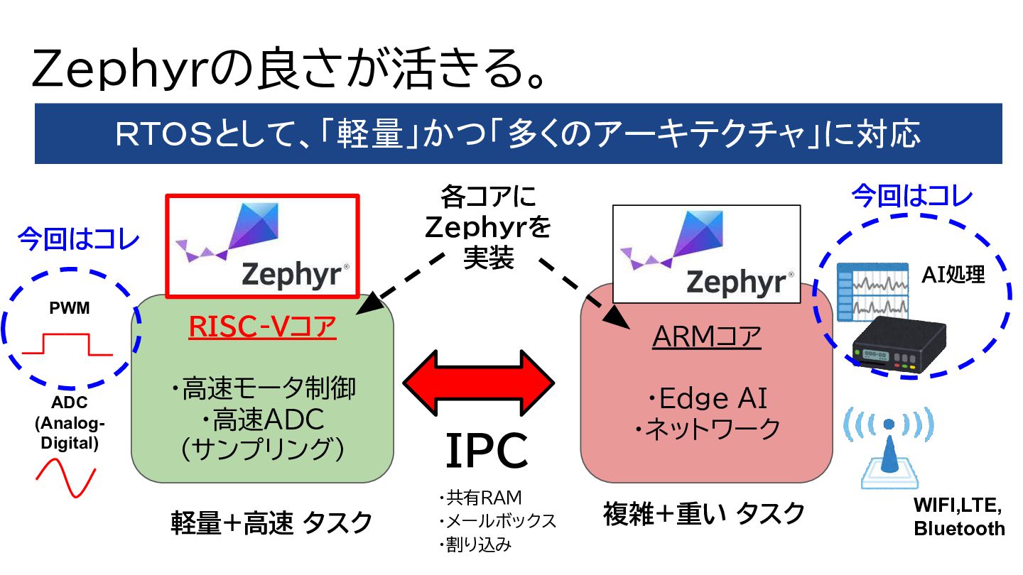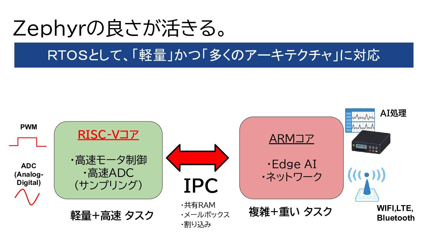 ・高速モータ制御 ・高速ADC (サンプリング) 軽量+高速 タスク PWM ADC (Analog- Digital) AI処理 WIFI,LTE, Bluetooth ・共有RAM ・メールボックス ・割り込み 各コアに Zephyrを 実装