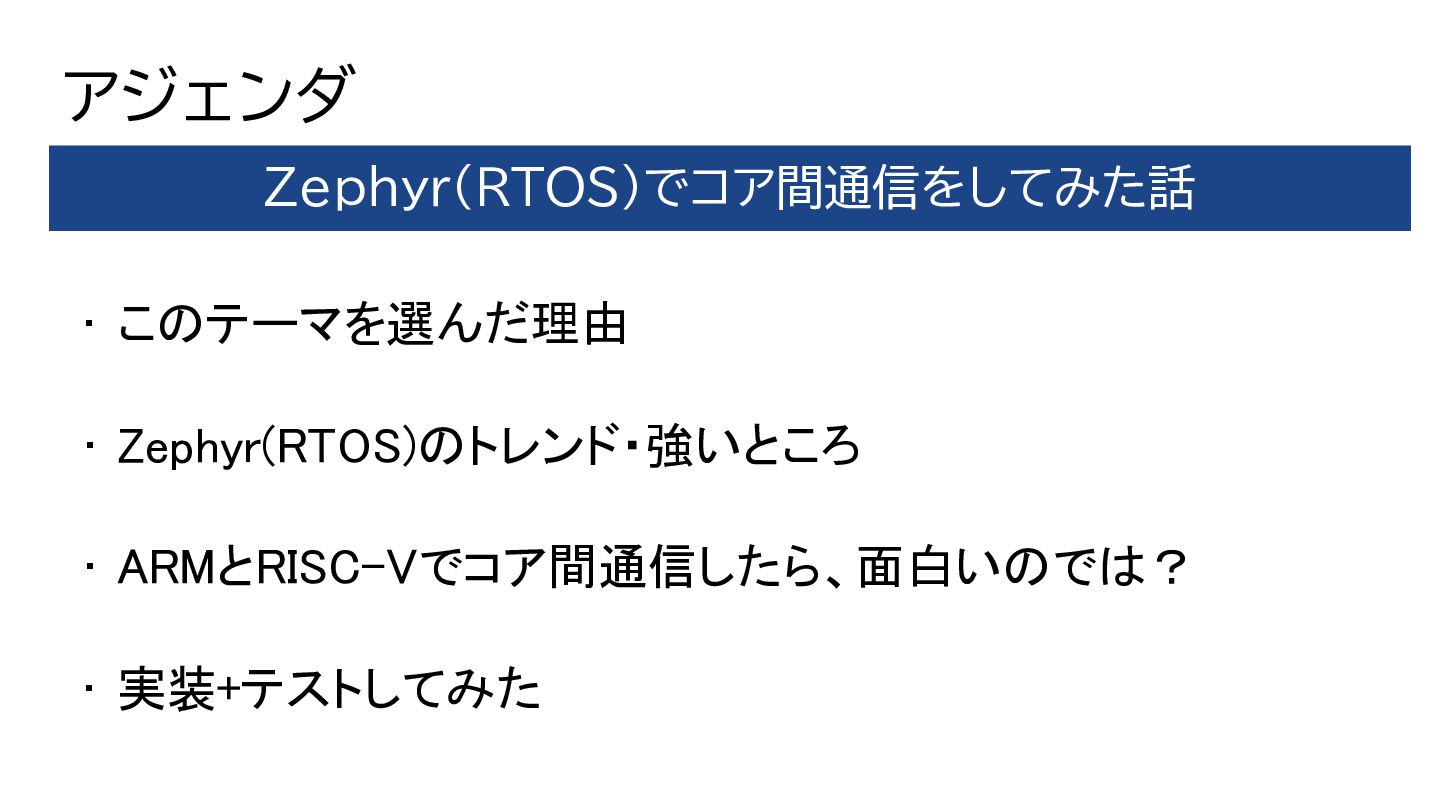アジェンダ • このテーマを選んだ理由 • Zephyr(RTOS)のトレンド・強いところ • ARMとRISC-Vでコア間通信したら、面白いのでは? • 実装+テストしてみた Zephyr(RTOS)でコア間通信をしてみた話