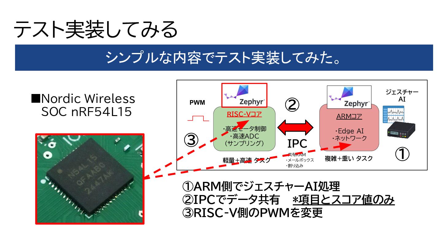 ・高速モータ制御 ・高速ADC (サンプリング) 軽量+高速 タスク PWM ジェスチャー AI ・共有RAM ・メールボックス ・割り込み ①ARM側でジェスチャーAI処理 ②IPCでデータ共有 *項目とスコア値のみ ③RISC-V側のPWMを変更 ① ② ③ ▪Nordic Wireless SOC nRF54L15