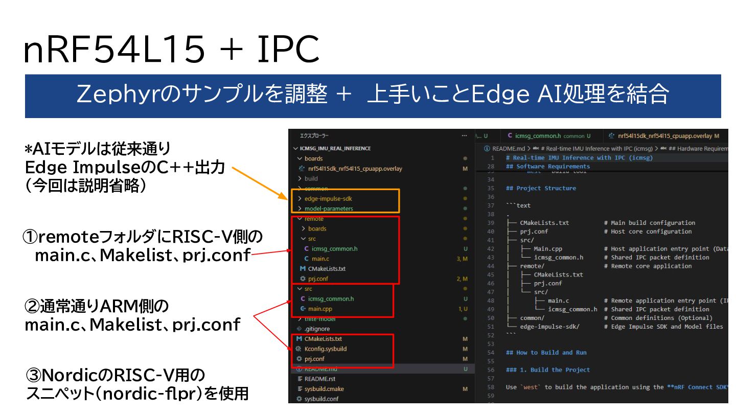 nRF54L15 + IPC Zephyrのサンプルを調整 + 上手いことEdge AI処理を結合 ①remoteフォルダにRISC-V側の main.c、Makelist、prj.conf ②通常通りARM側の main.c、Makelist、prj.conf
